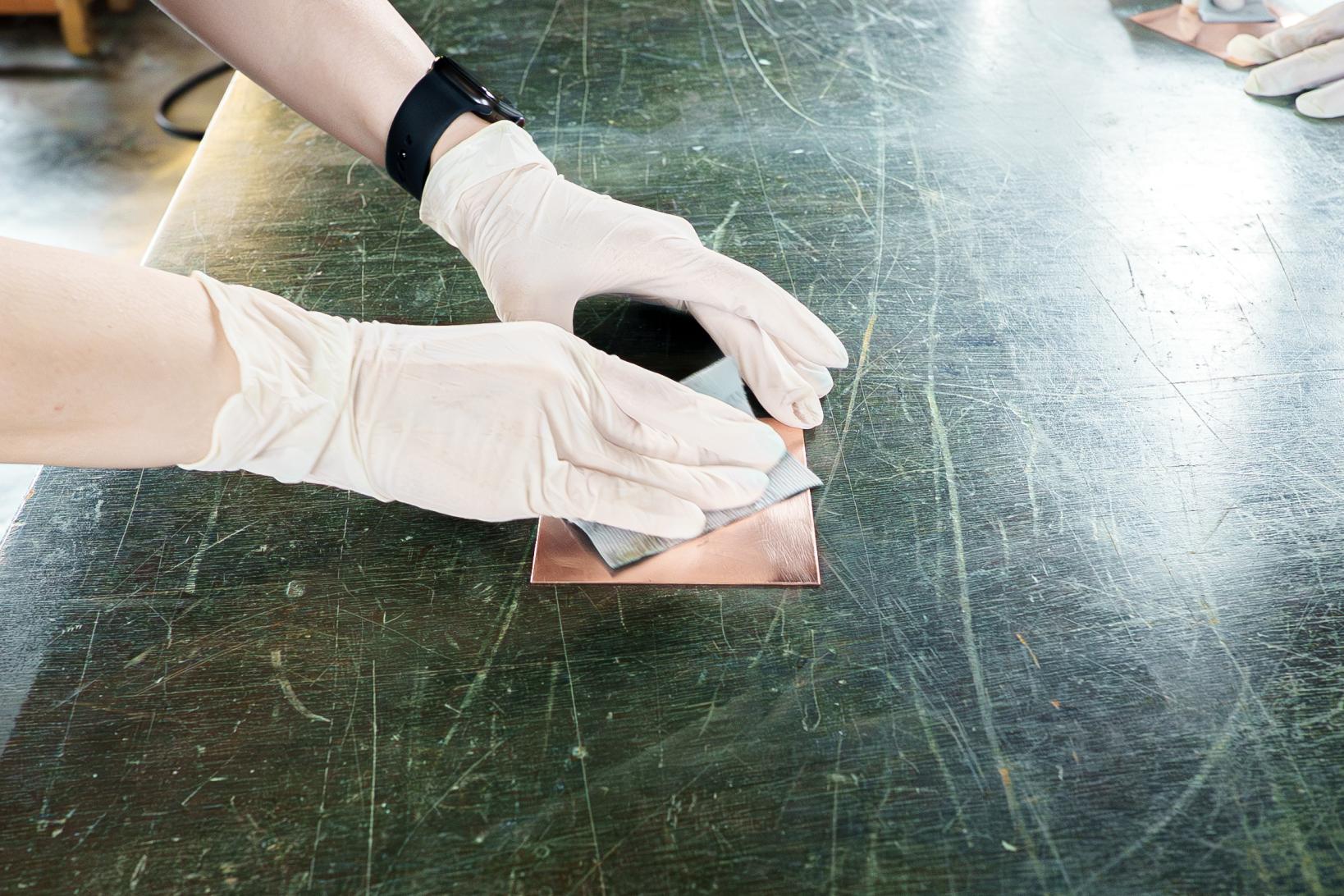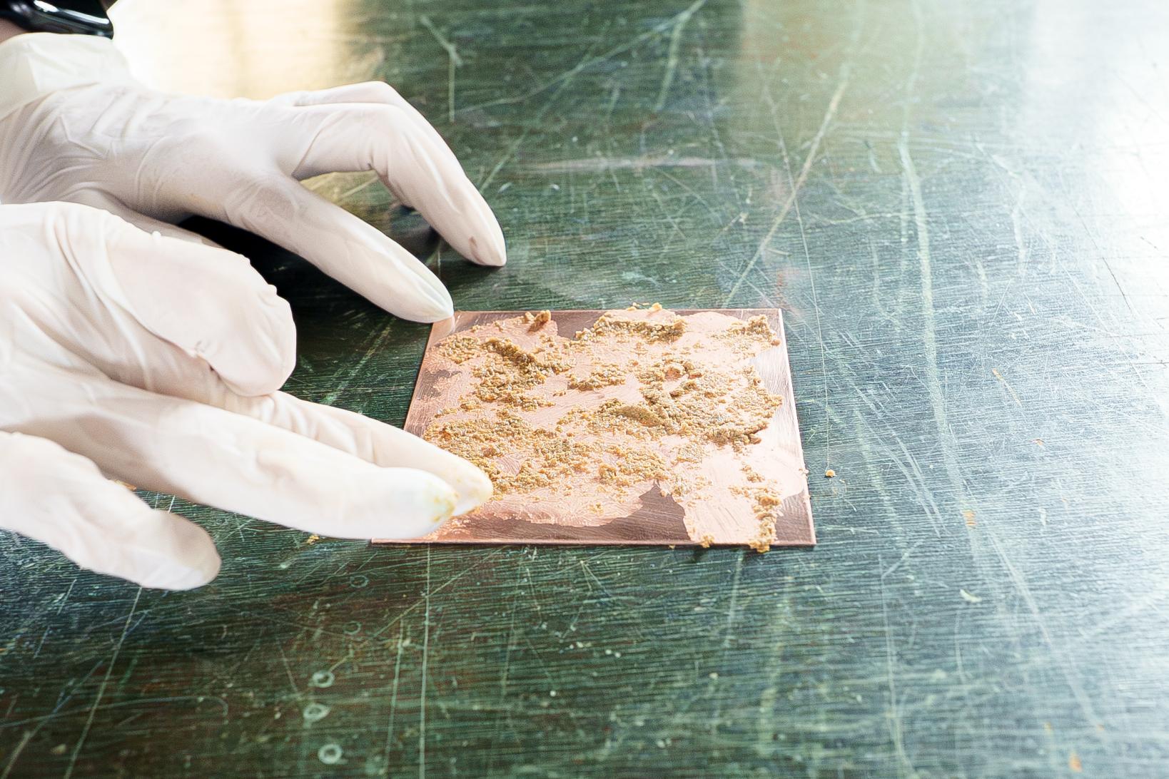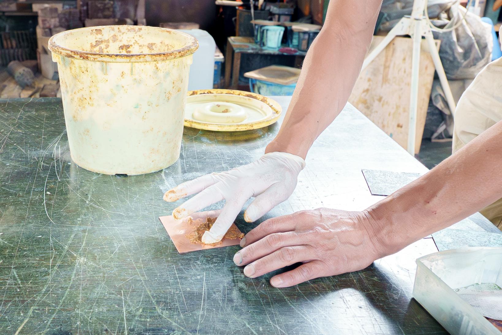 焼いて冷ました後は、薬品を銅板に塗布していくのですが、薬品は水っぽすぎず、乾きすぎず絶妙な塩梅で塗布することが重要とのことです!