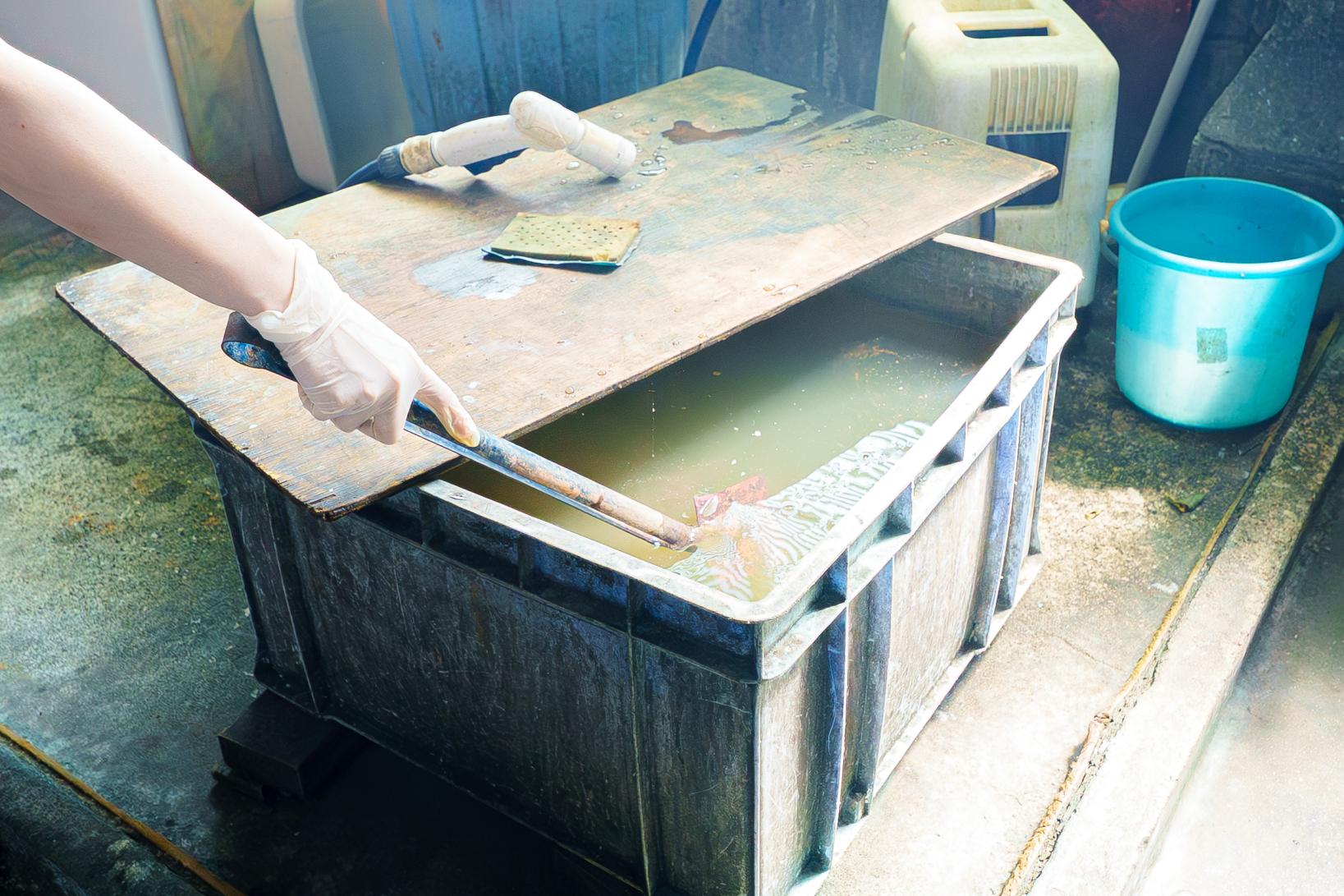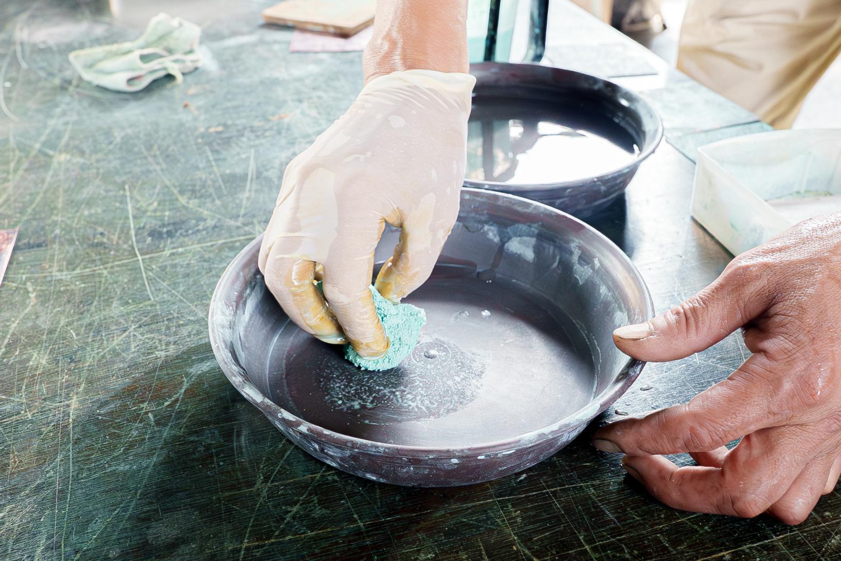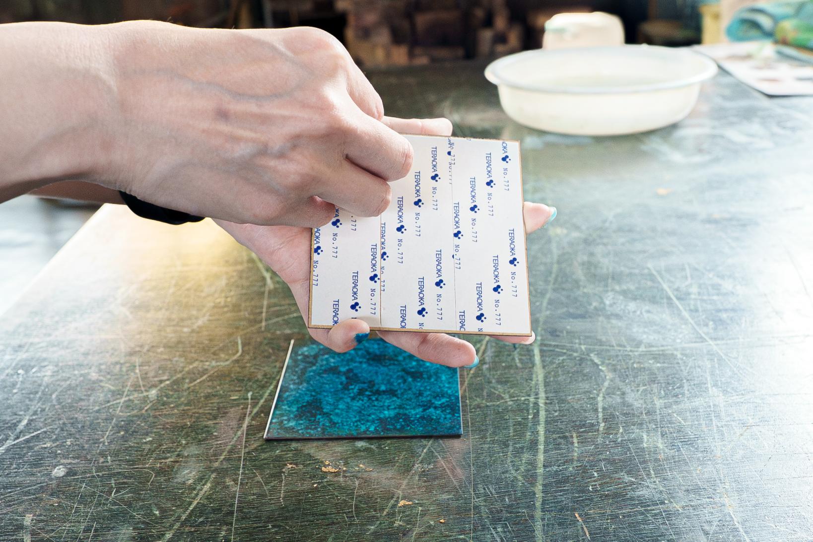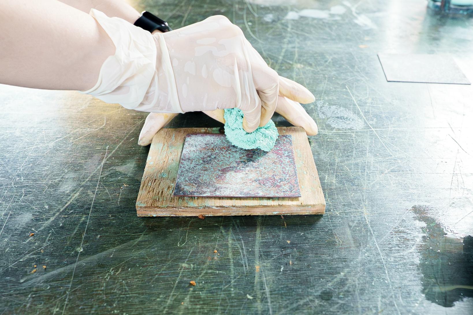 焼いて冷ました後は、薬品を銅板に塗布していくのですが、薬品は水っぽすぎず、乾きすぎず絶妙な塩梅で塗布することが重要とのことです!