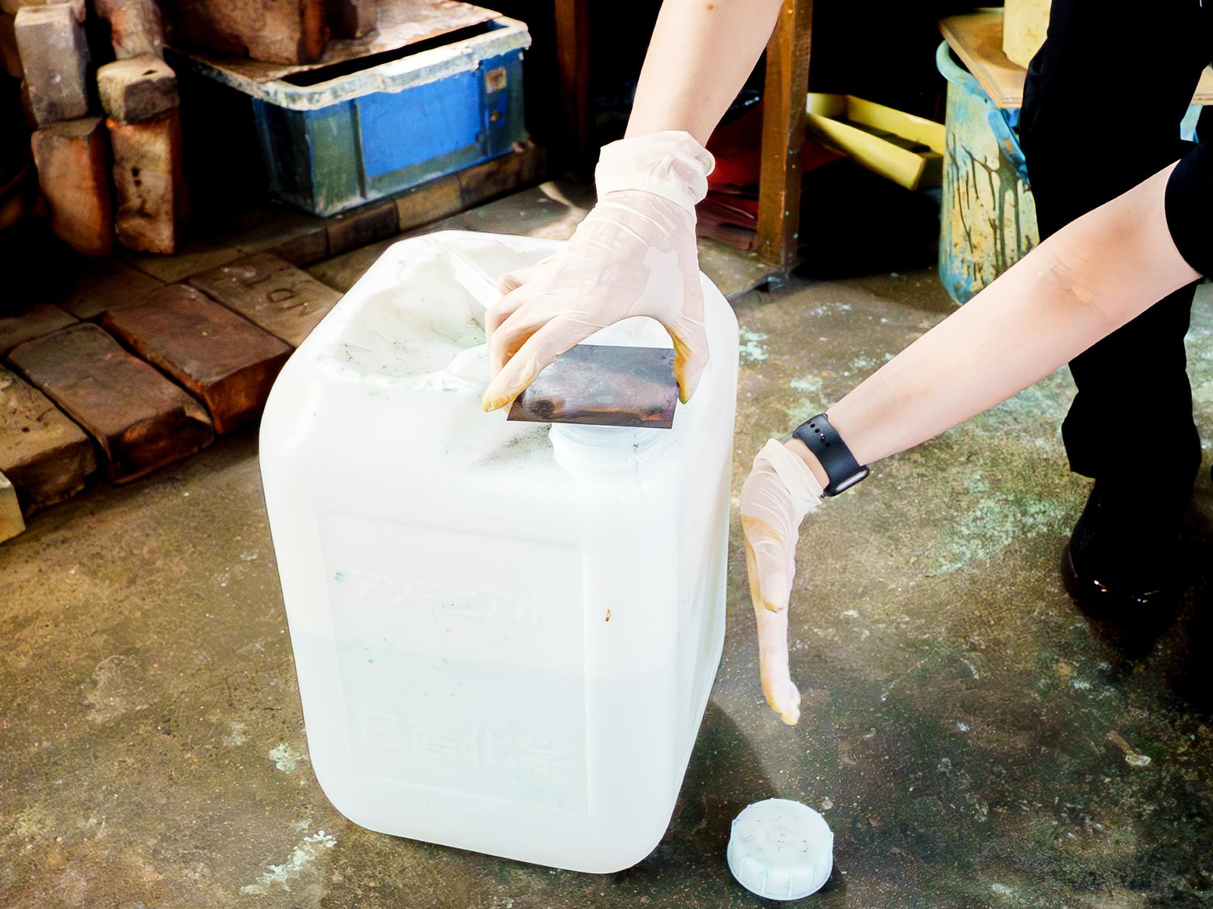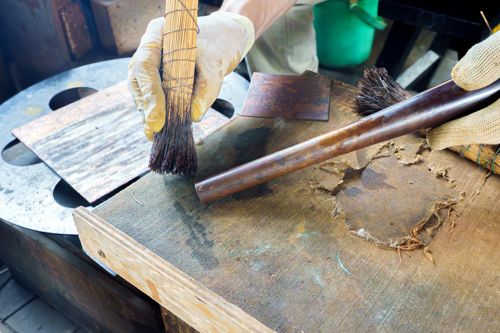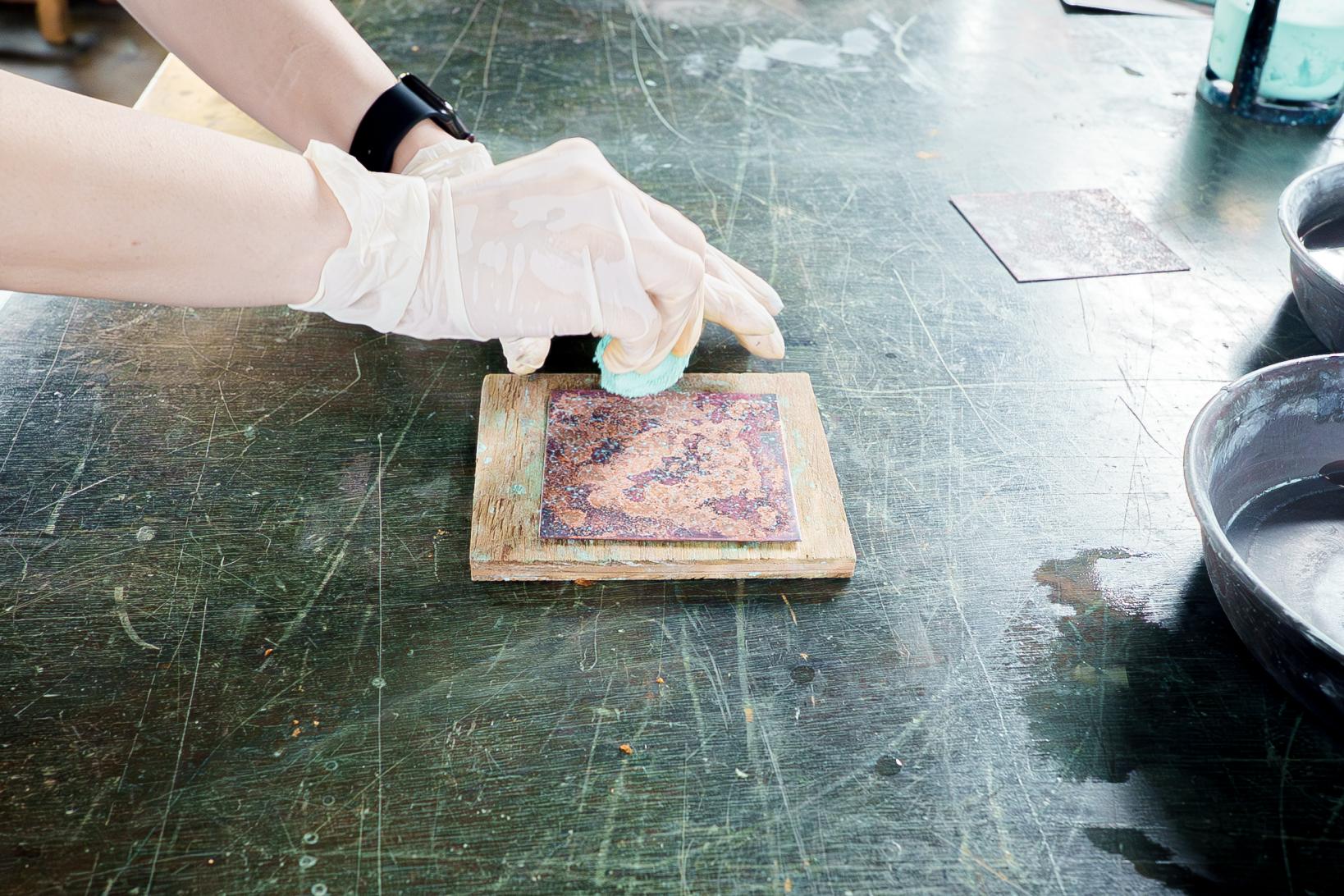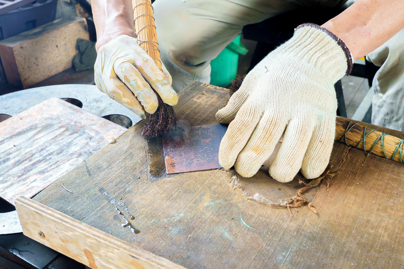 こちらの薬品は、銅のさび=緑青(ろくしょう)を発生させるものだそうで、ムラなくトントンと優しく全体に塗布して乾かす作業を3回程繰り返し、緑青の皮膜を厚くしていきます!