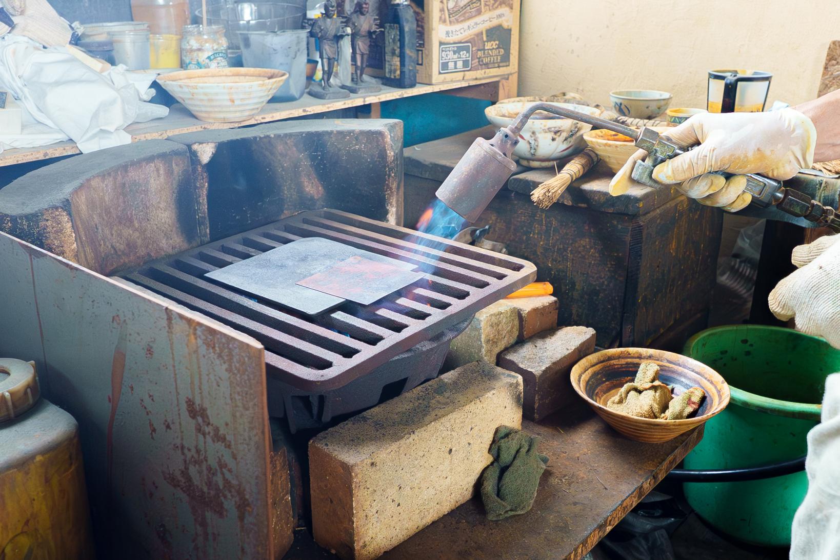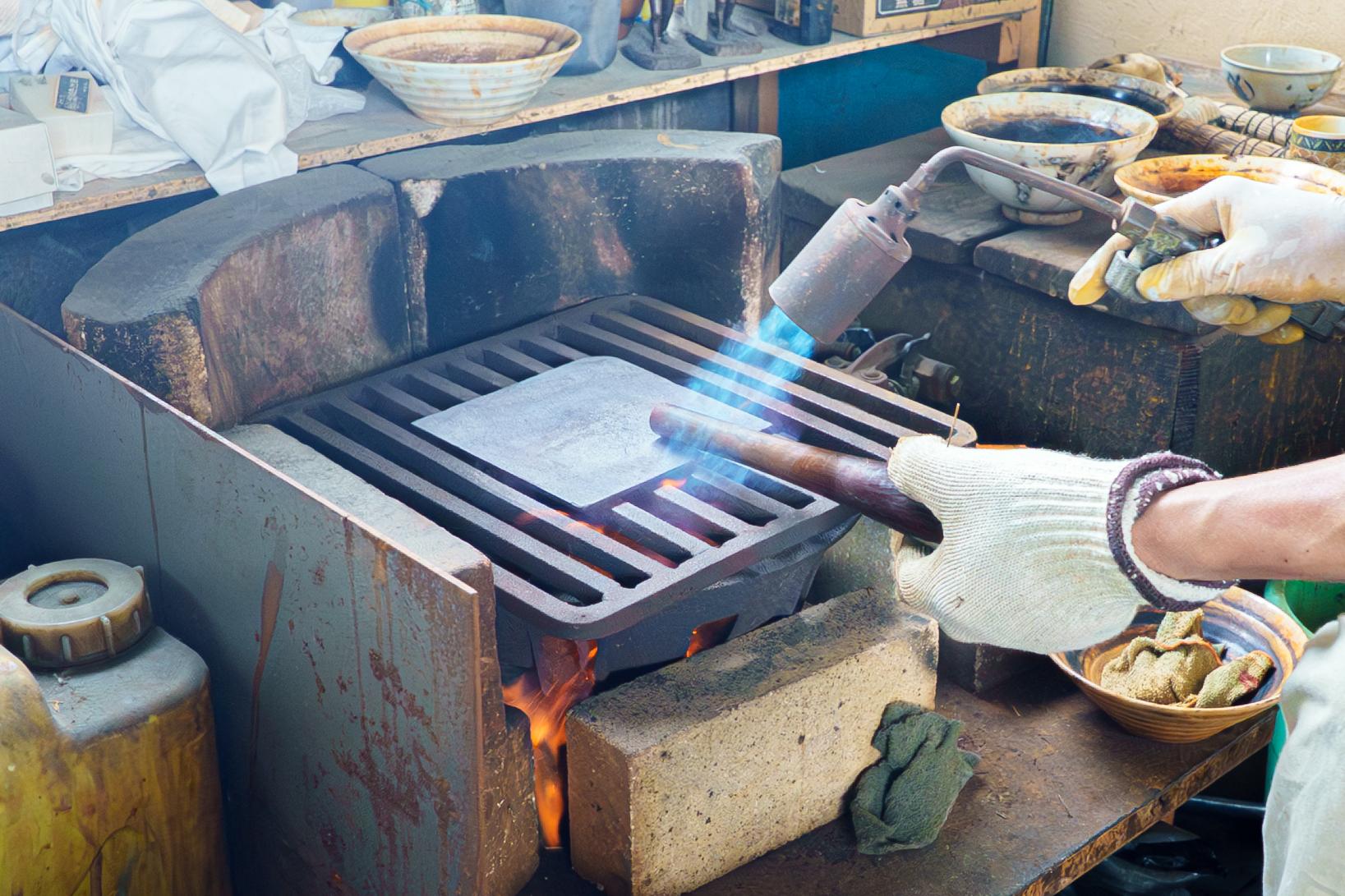 先程、糠を塗った銅板をバーナーで焼いていきます!