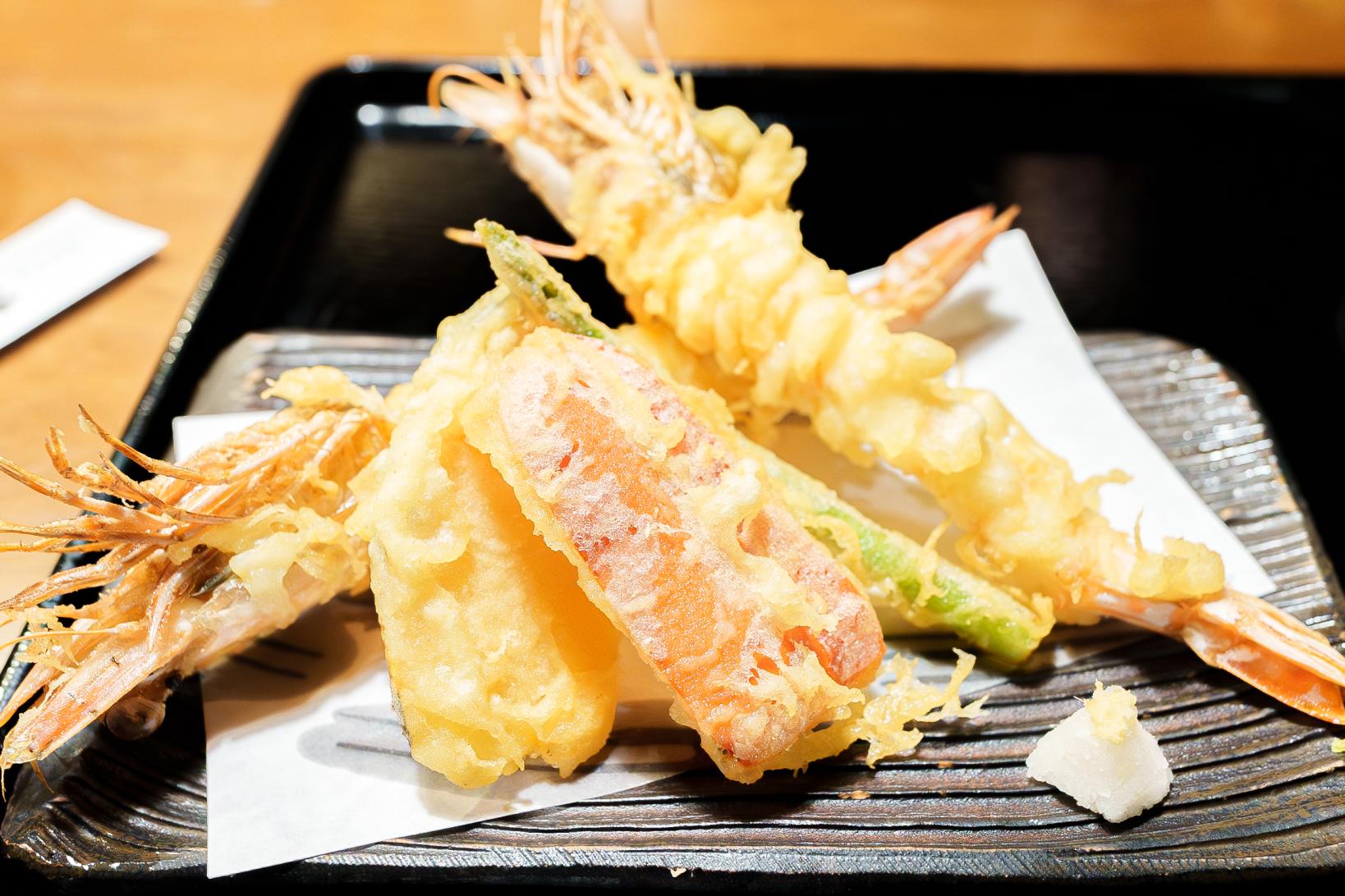 蕎麦は、ざる蕎麦と温かいかけ蕎麦のいずれかを選択することができ、天ぷらは2本の大きい海老、地元の野菜の盛り合わせが付いてきます!
