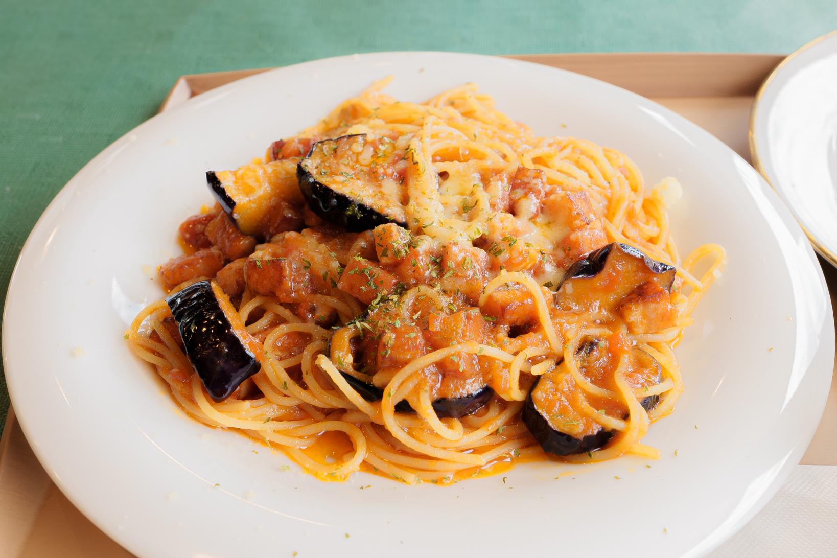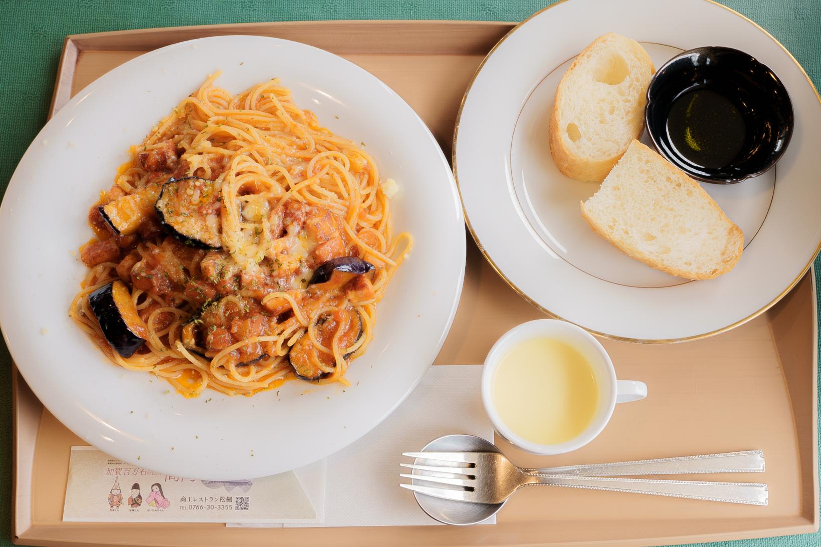 パスタは茄子とベーコンのトマトソースで、前菜とパン、スープがついてきました!