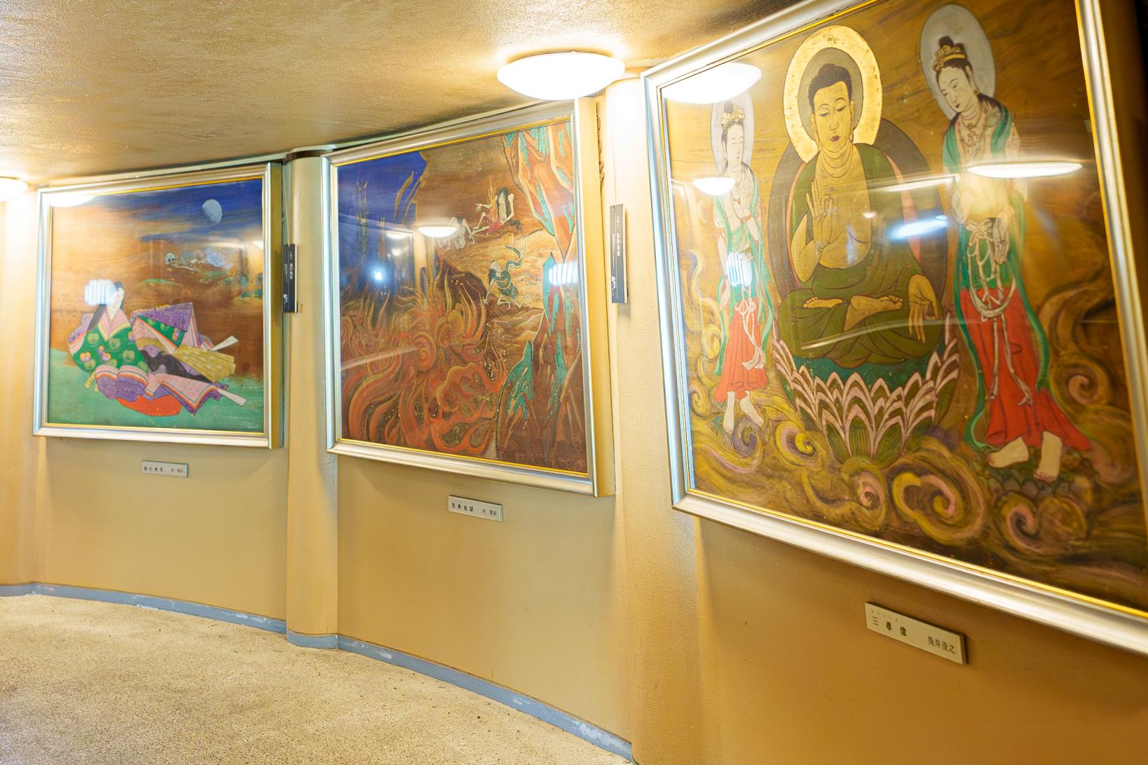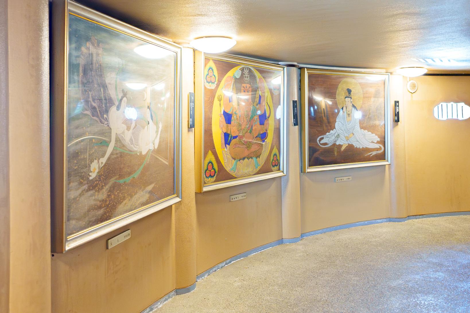 高岡大仏が鎮座している台座の内部は回廊になっており、1952年当時の高岡在住の日本画家たちの手によって描かれた仏画13作が展示されています。