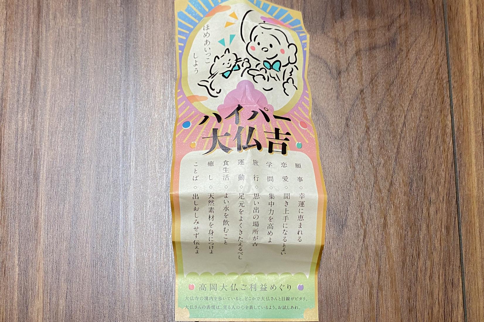 購入してみると中には缶バッジとおみくじが入っていて、おみくじはハイパー大仏吉でした!