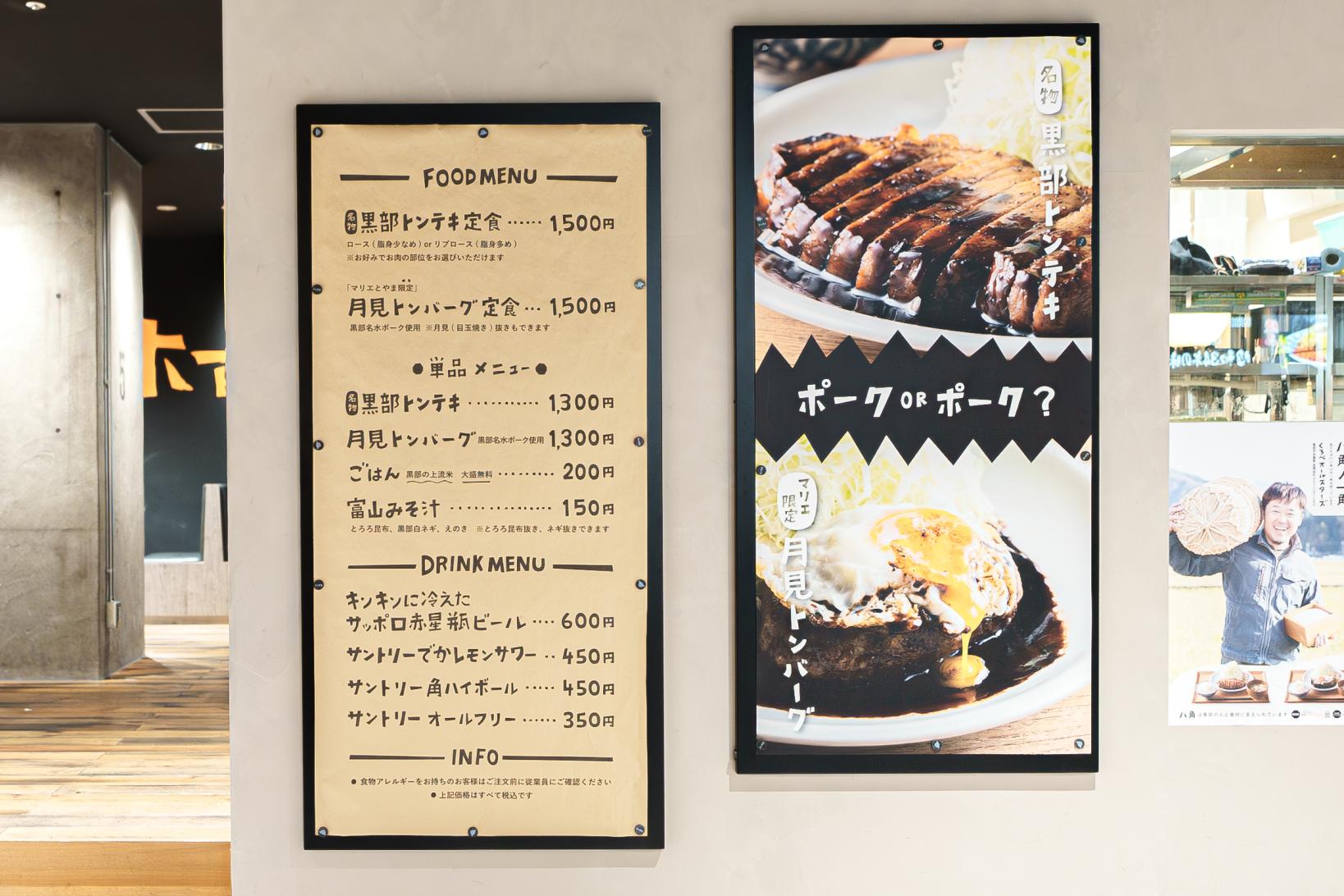 メインメニューは、黒部トンテキとマリエとやま店限定の月見トンバーグです。