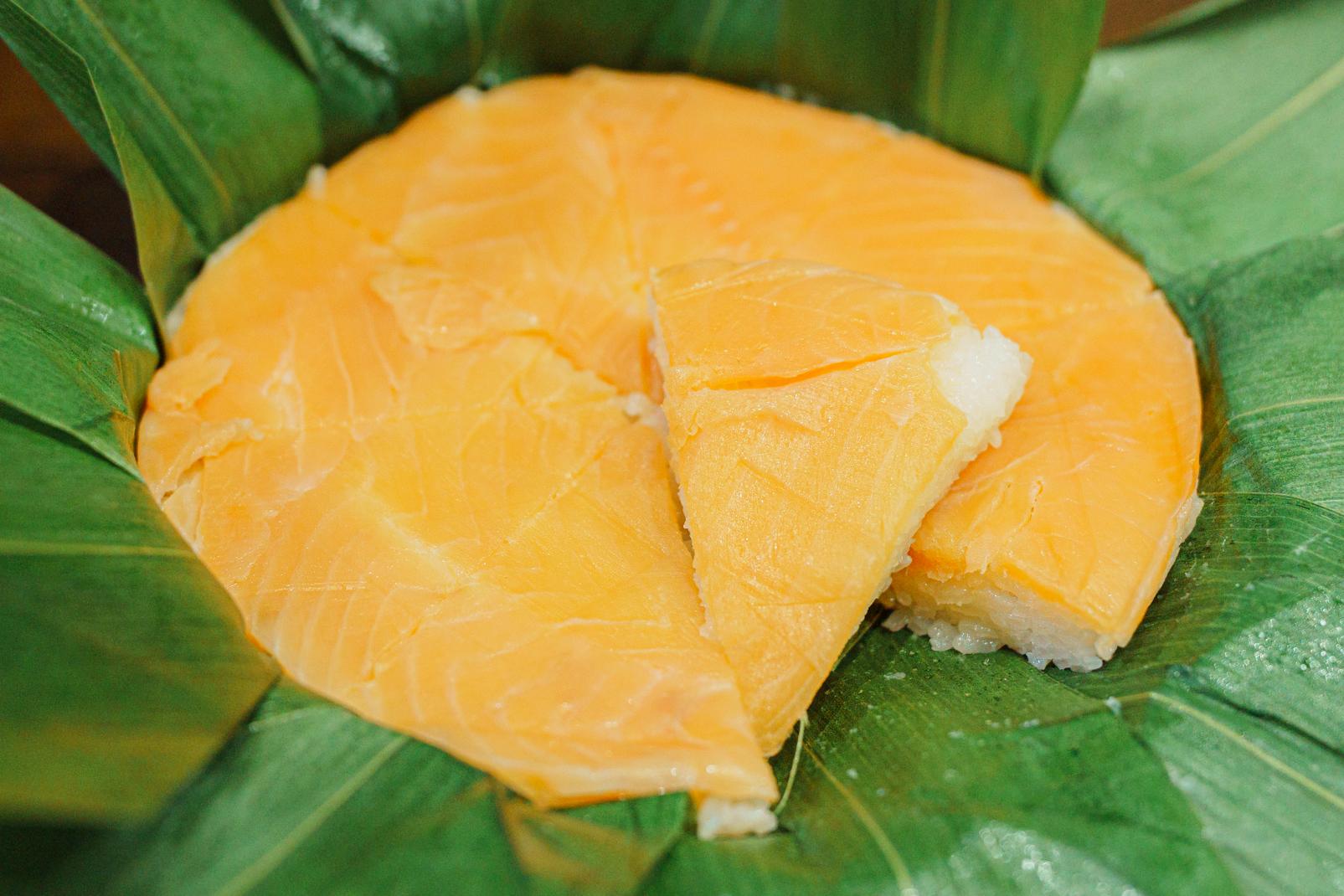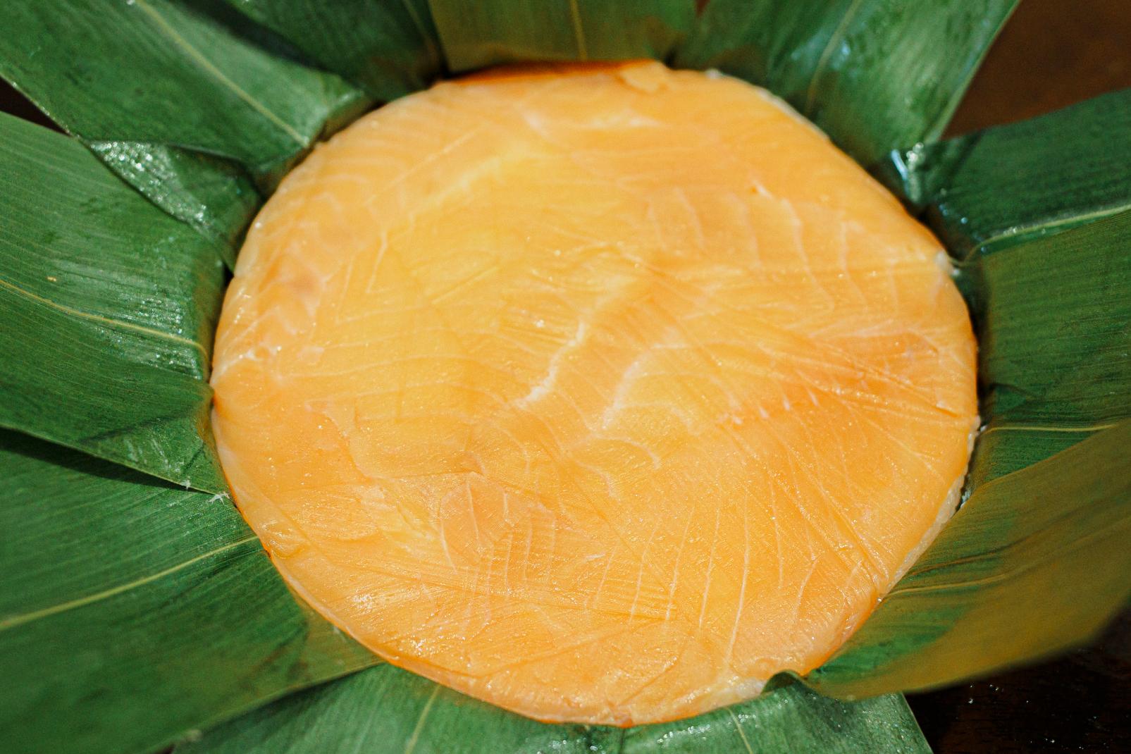緑が濃く香りの良い国産笹の上に、富山県産米を使用した鮮やかなますのすし。