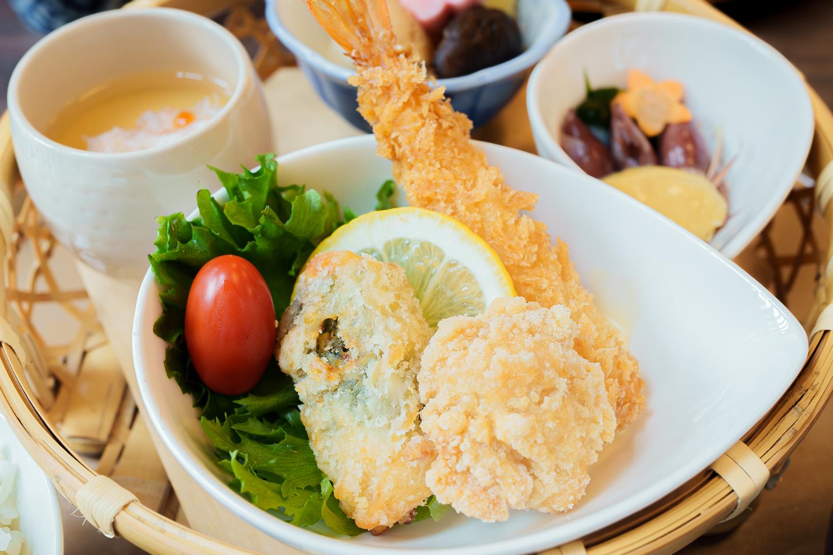 メインのフライはエビフライ、白身魚のシソ揚げ、鶏の竜田揚げの3種類で、どのフライもサクサクでジューシー!
