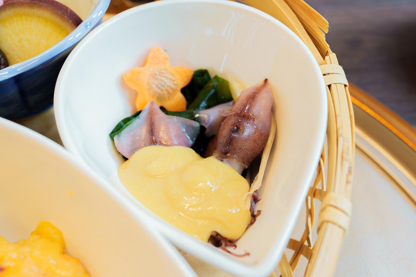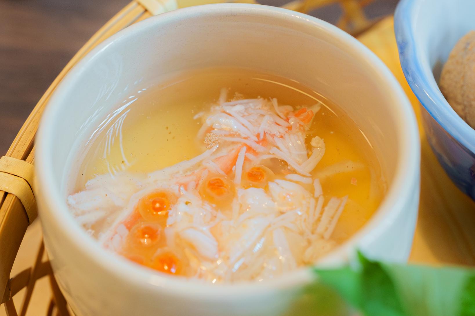 そしてホタルイカのボイル、カニとイクラの茶碗蒸し、煮物の3品と炊き込みご飯、お味噌汁が付いてきます。