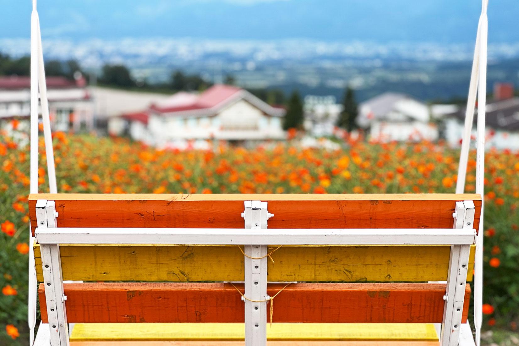 キバナコスモス畑には、ベンチやブランコが設置されていて、絶好の撮影スポットとなっています。