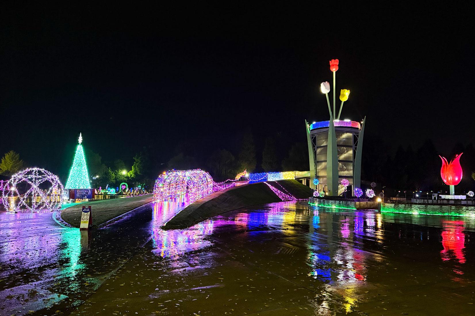 チューリップ公園は広いので、南口や東口から入るとイルミネーションがあるエリアまでかなり遠いので気をつけてください。