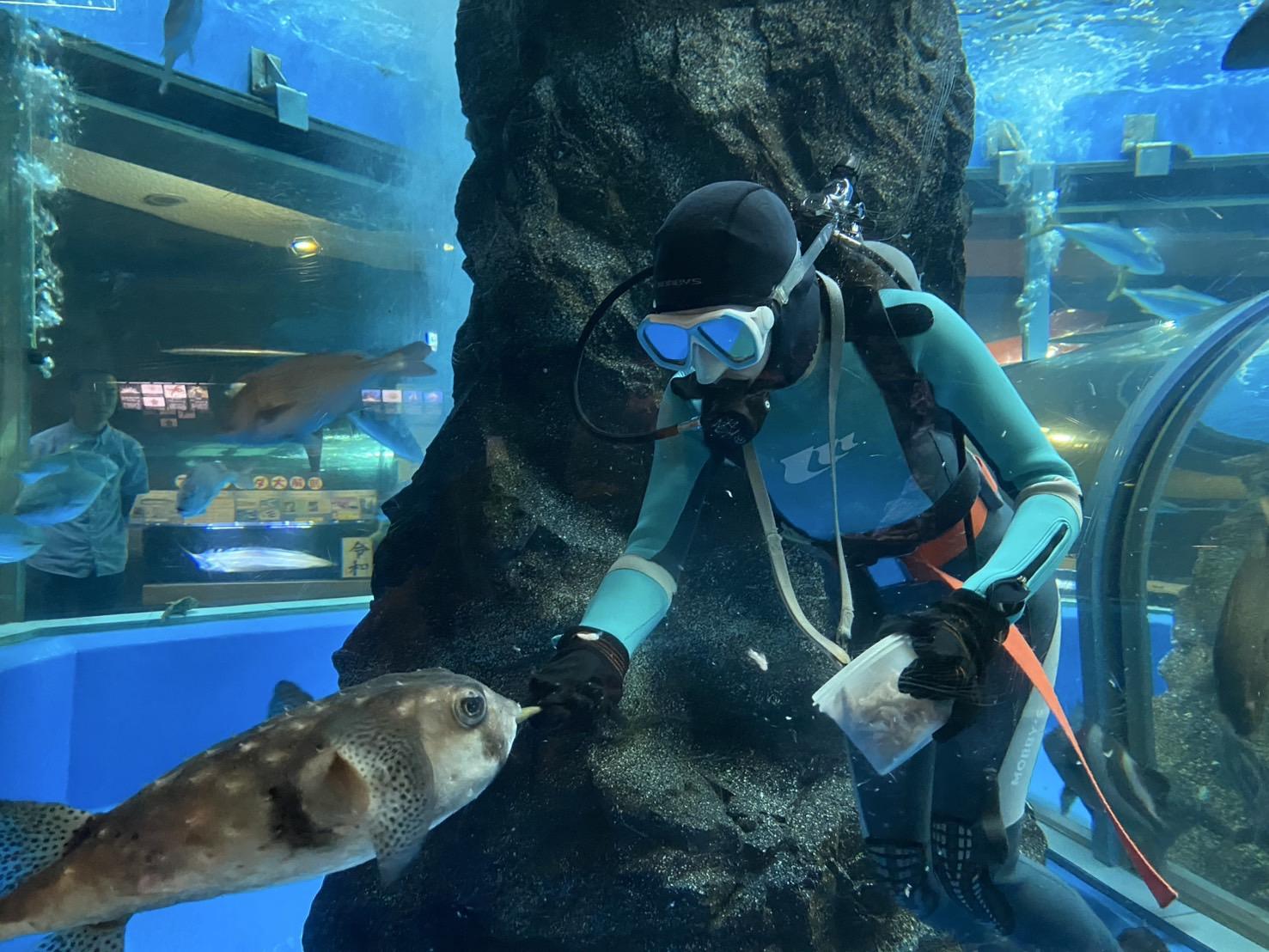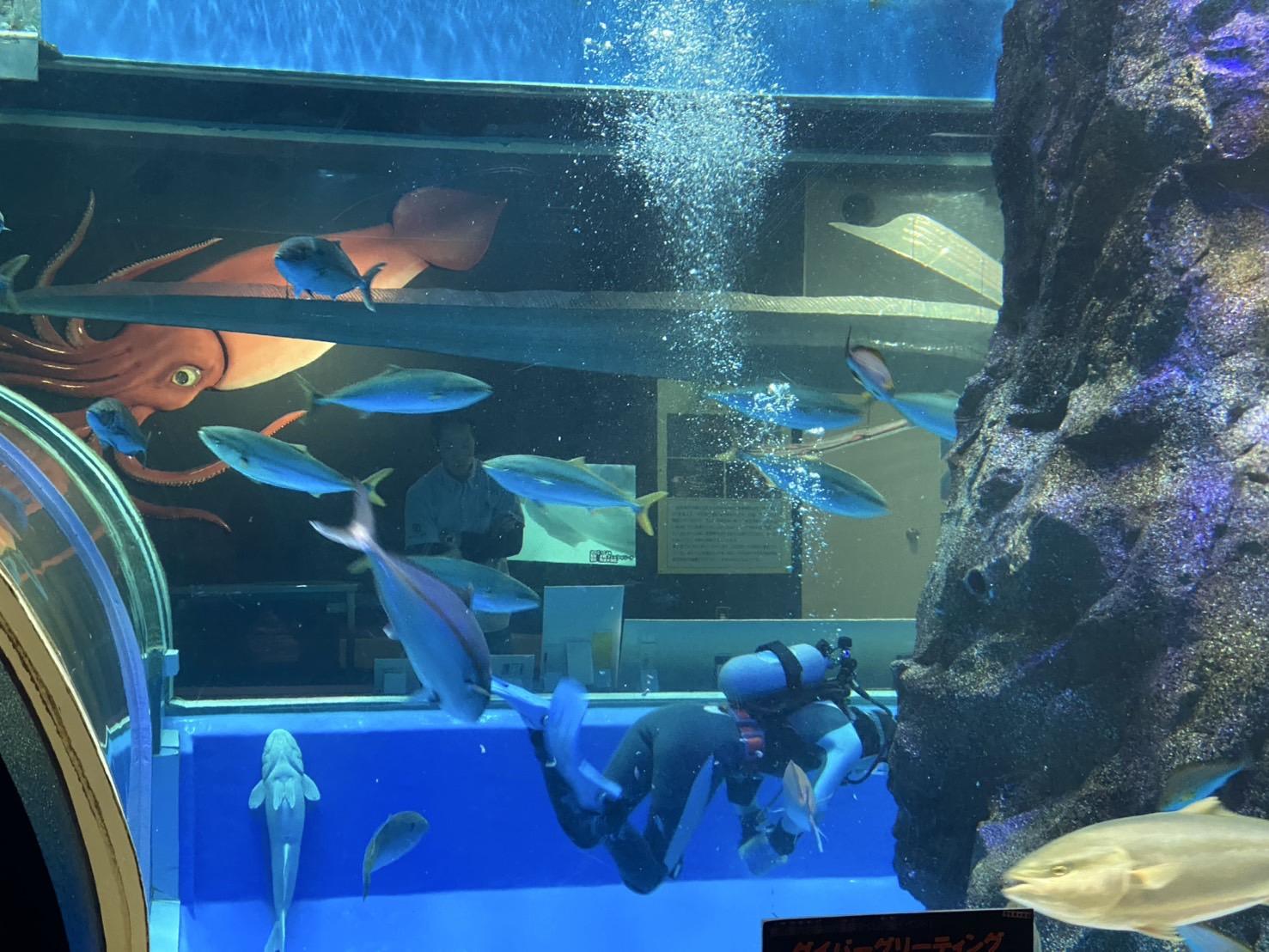 1か所目は、水族館の中心に位置する「富山湾大水槽」です。ブリやカンパチなど、富山湾を代表する魚たちが悠々と泳ぐ姿を眺めながらの作業は、格別の体験。
