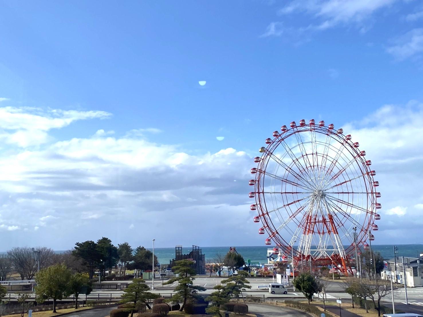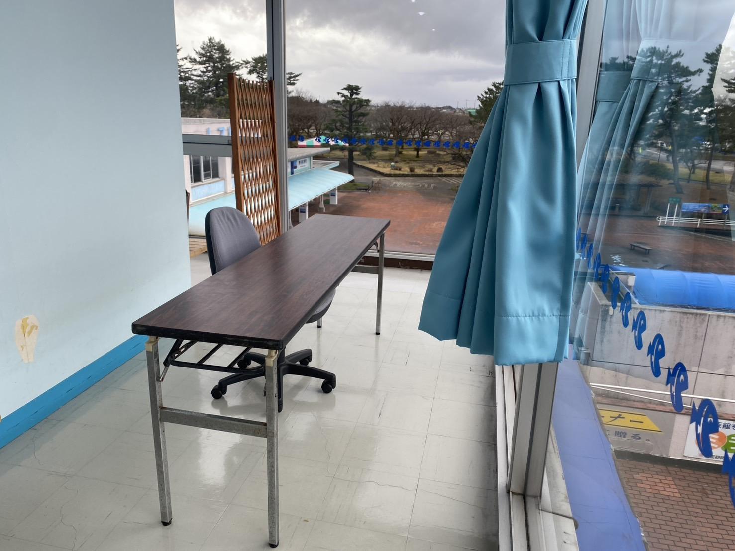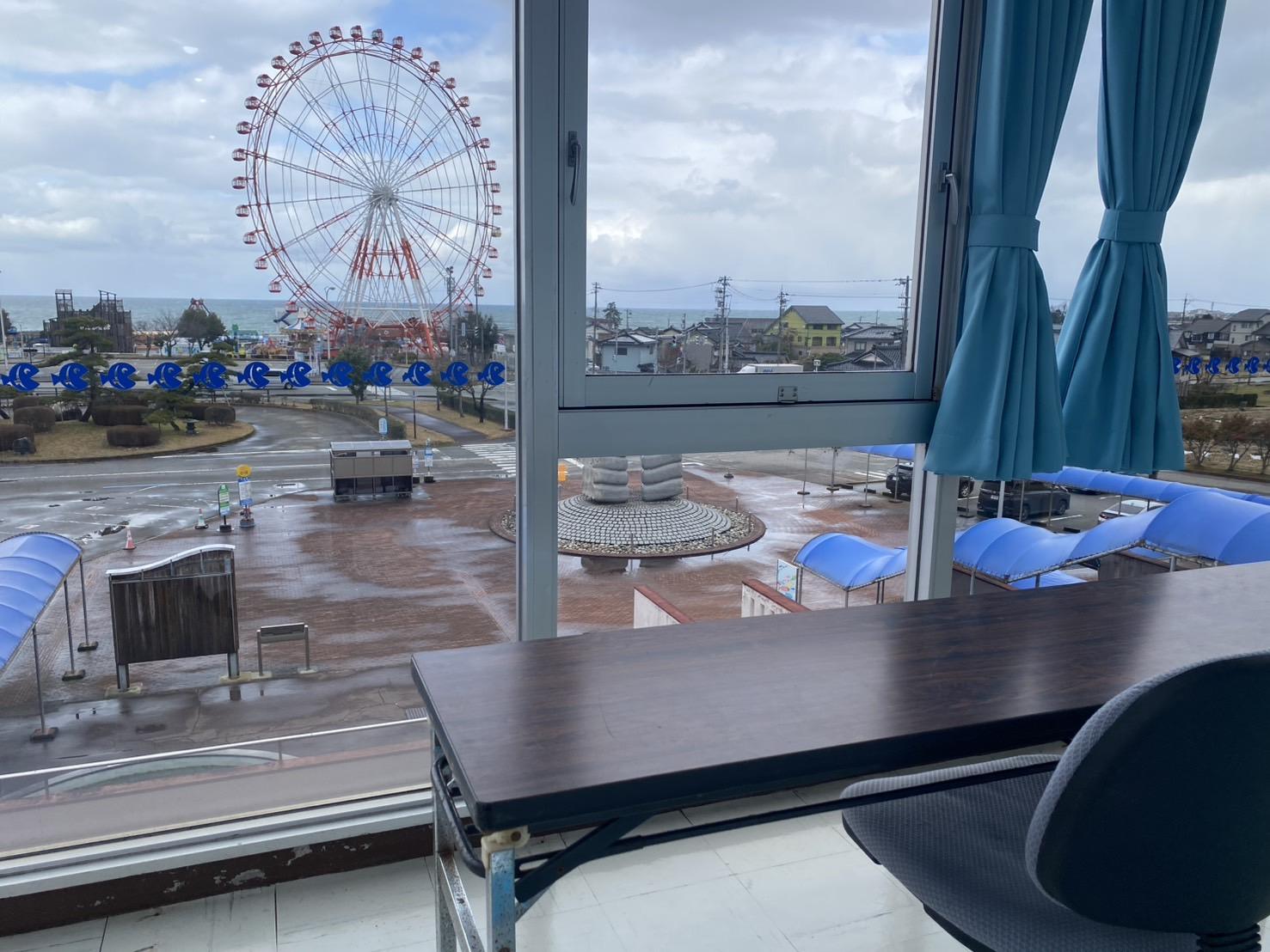ここからは、魚津ミラージュランドの観覧車や、美しい富山湾の風景を一望できます。展示コーナーから少し離れた場所にあるため、落ち着いて仕事に集中できるのが魅力です。