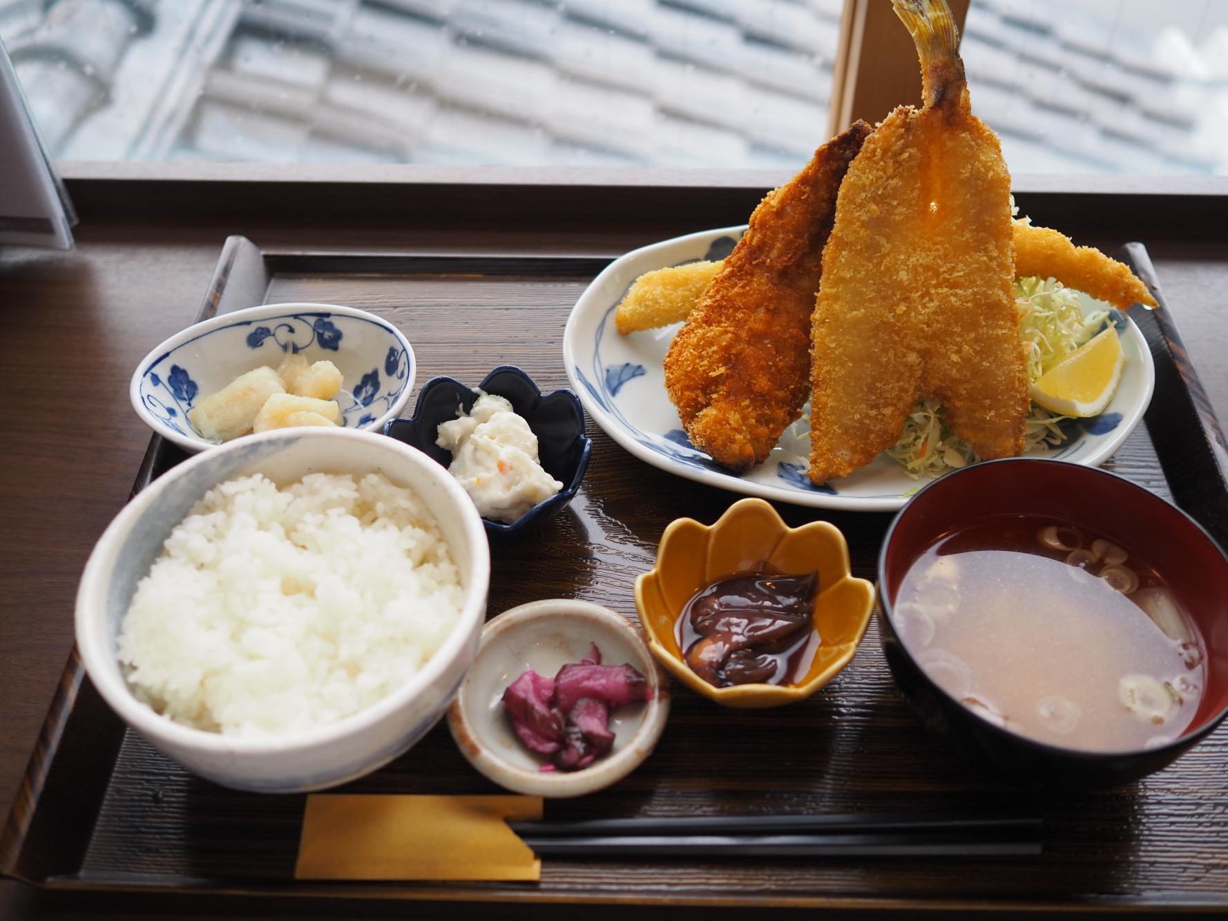 今回いただいたのは、3種類の魚が使われたフライ定食。ボリューム満点で、サクサクの衣とふんわりとした魚の食感が絶品です。