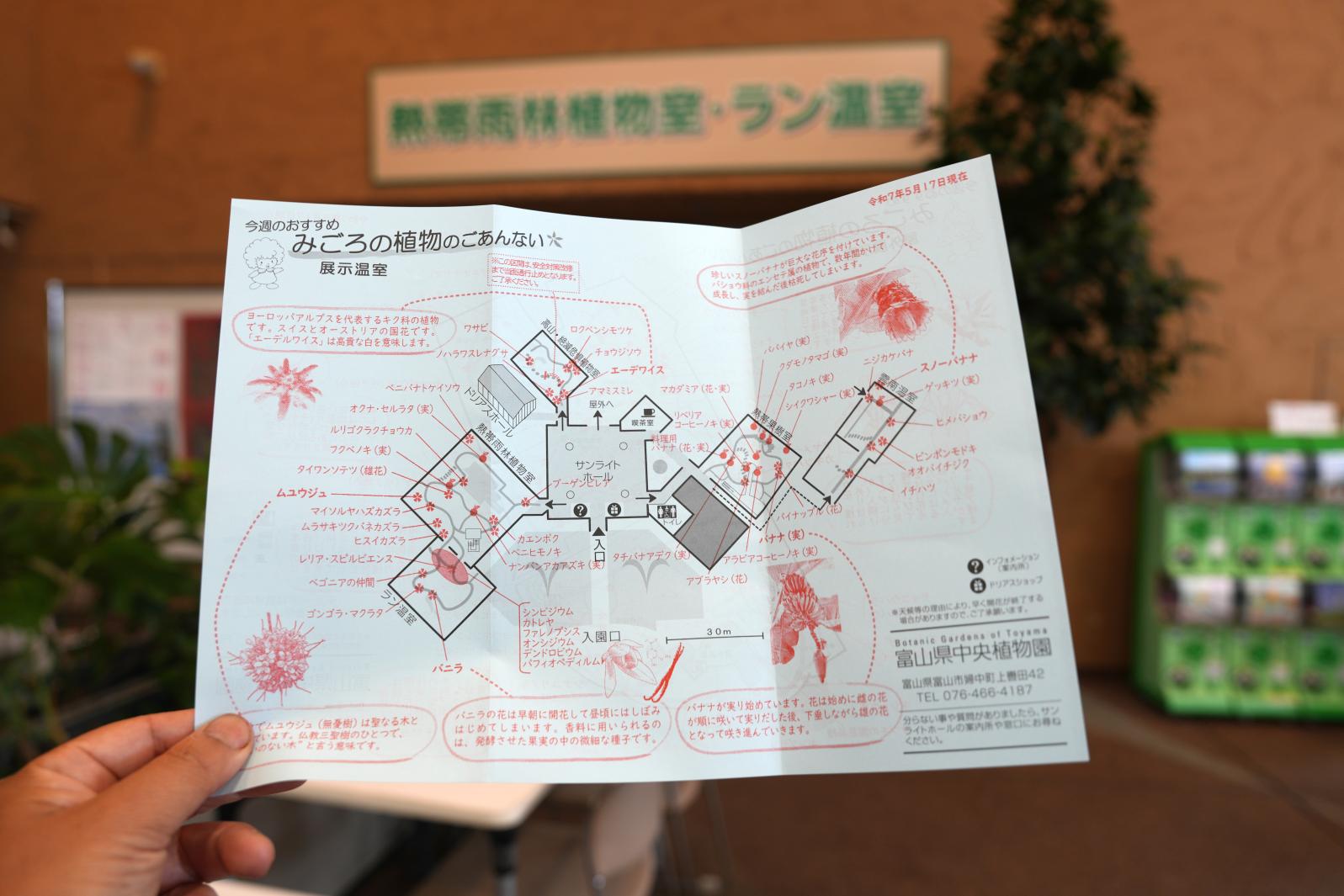 5つの温室があり、「熱帯雨林植物」「熱帯果樹」「ラン」「雲南植物」「高山・絶滅危惧」と、見どころがいっぱいです。まずは、園内入口で、マップをゲット!手作りのマップ(*見どころを毎週土曜日に更新!屋外展示園と展示温室の両面あり!)はとてもわかりやすく、地図を頼りに、園内を巡るととても面白いので、ぜひ!