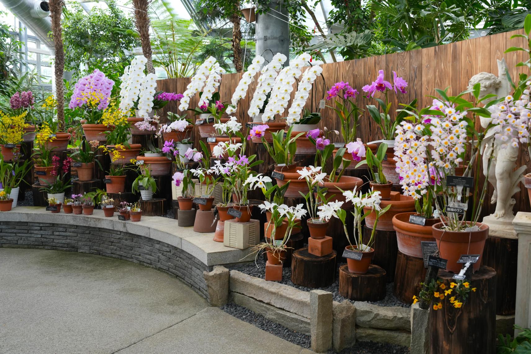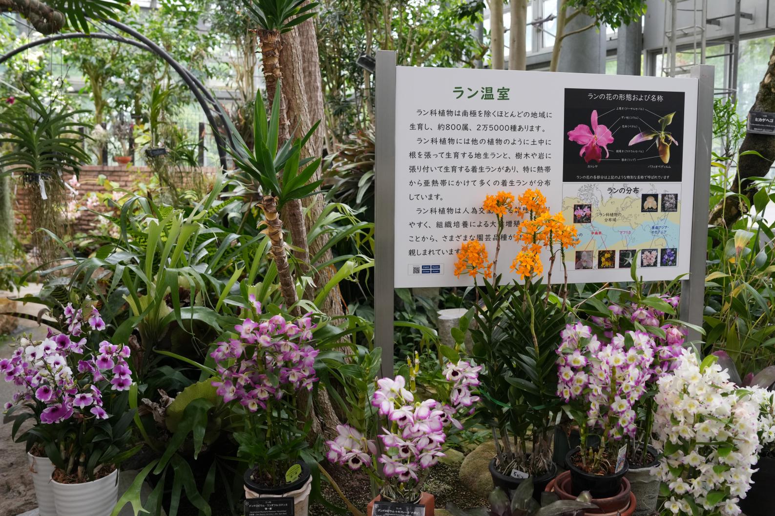 「ラン温室」では、一歩足を踏み入れると甘い香りが漂い、色鮮やかな花々が出迎えてくれます。常時約200鉢のランが展示されており、見ごたえのある豪華な花から、なかなか見ることのできない珍しい品種まで、多彩なランを楽しむことができます。