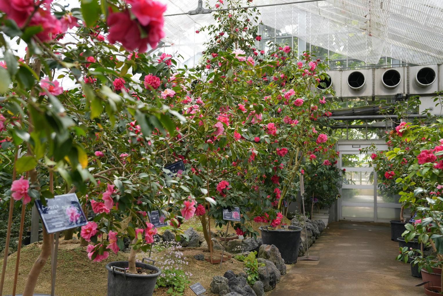 「雲南温室」は、中国・雲南省の多様な植物を紹介する展示施設です。トウツバキを中心に展示してあり、直径15cmほどにもなる八重咲の花々は、とても迫力があり、美しいです。