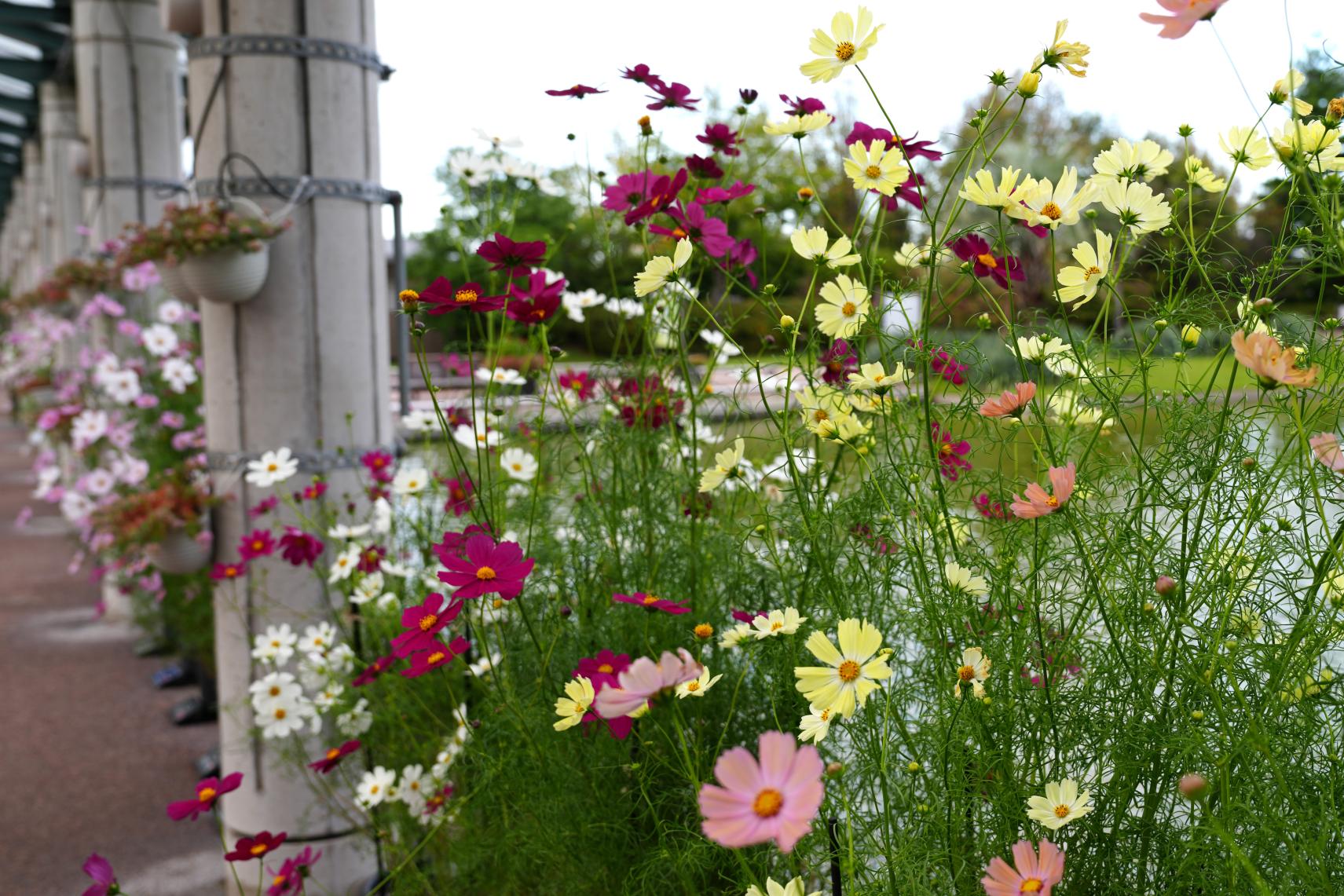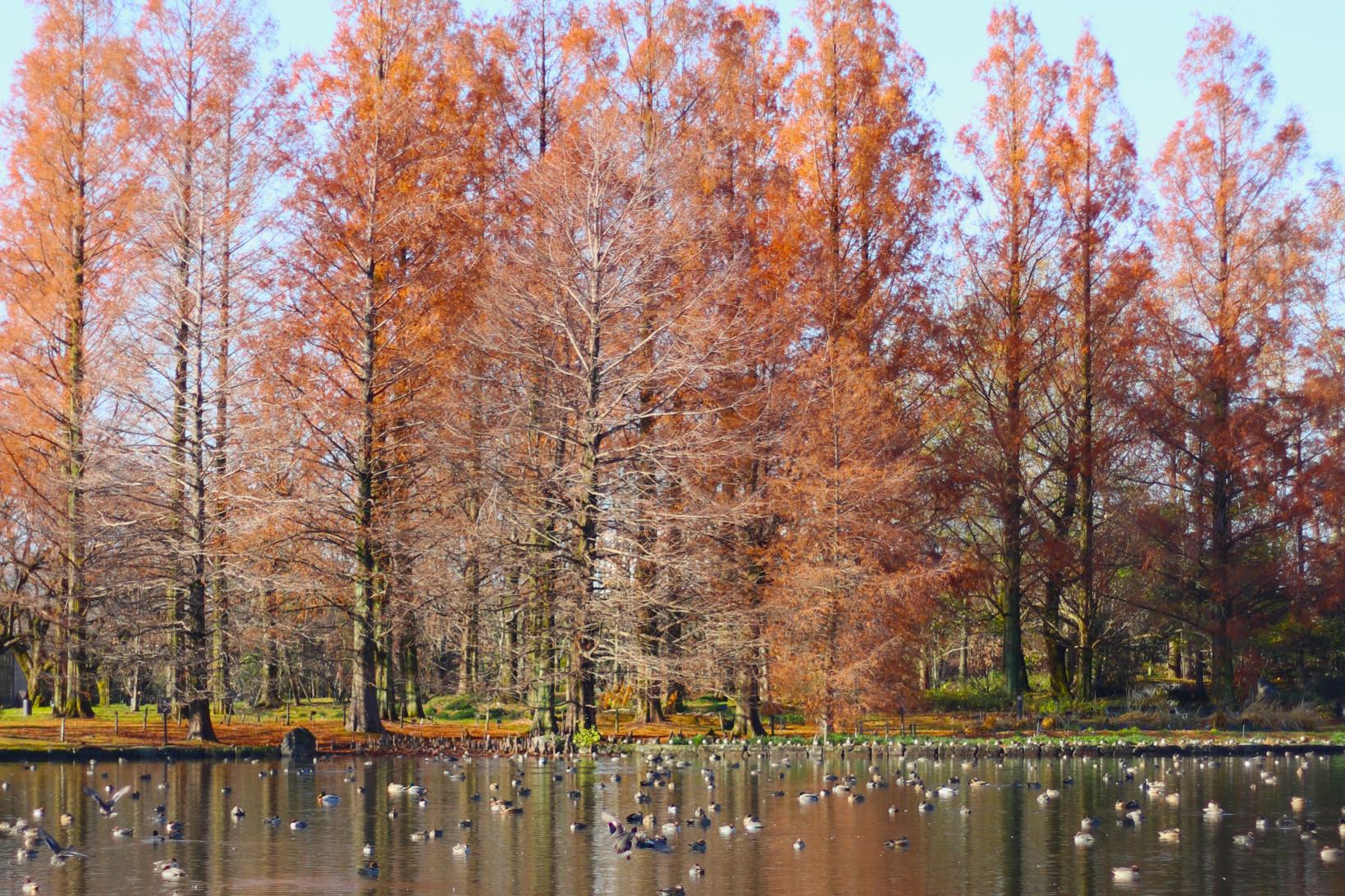秋、園内では、紅葉したメタセコイヤや落葉が積もるヌマスギ、子供の背丈より大きいパンパスグラス、珍しいコスモスの展示など、秋ならではの風景も魅力がいっぱいです。