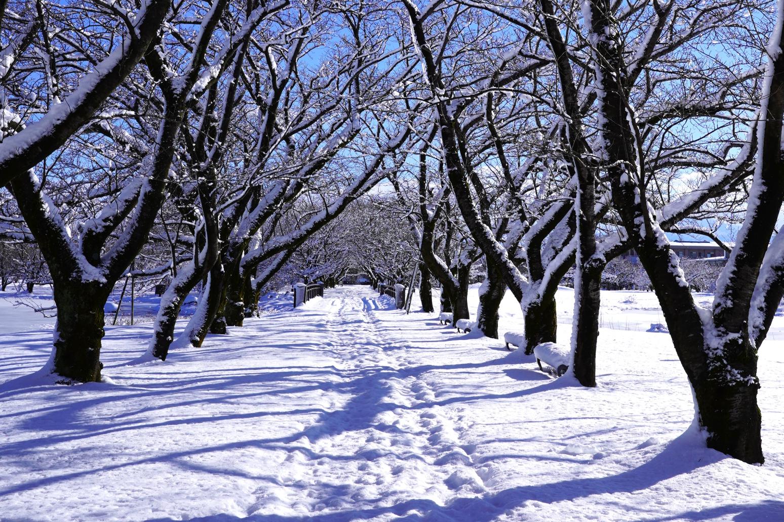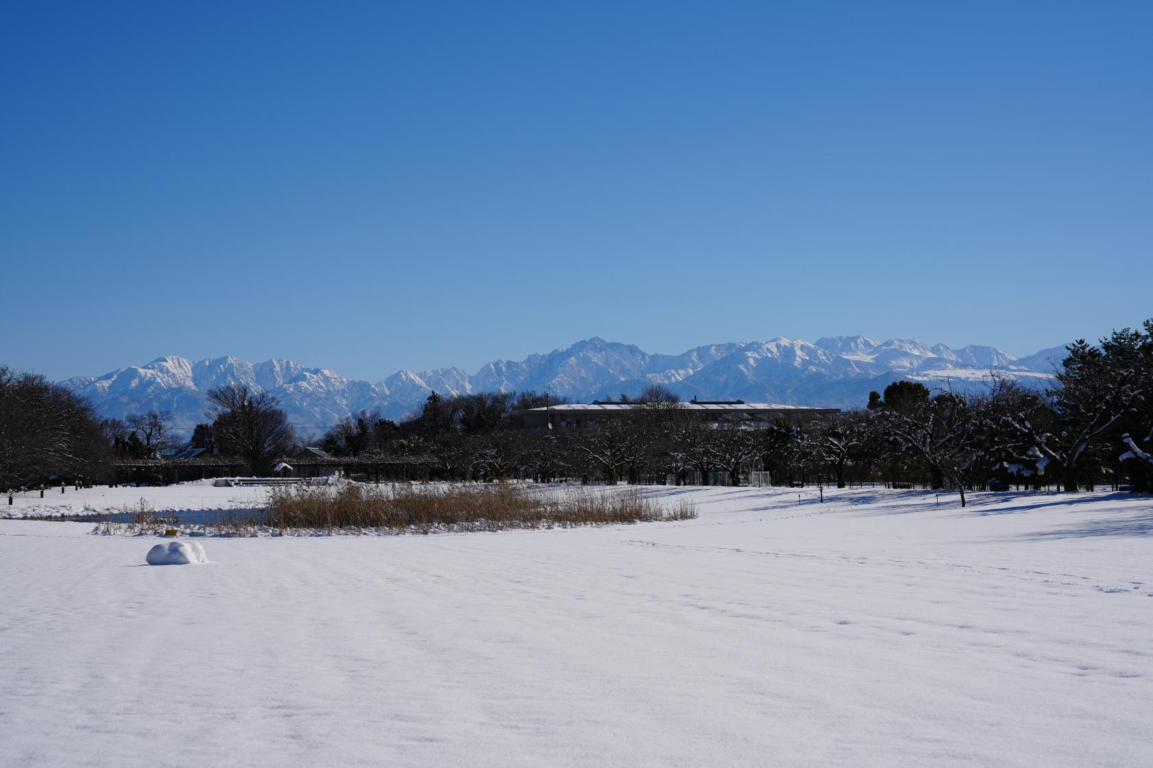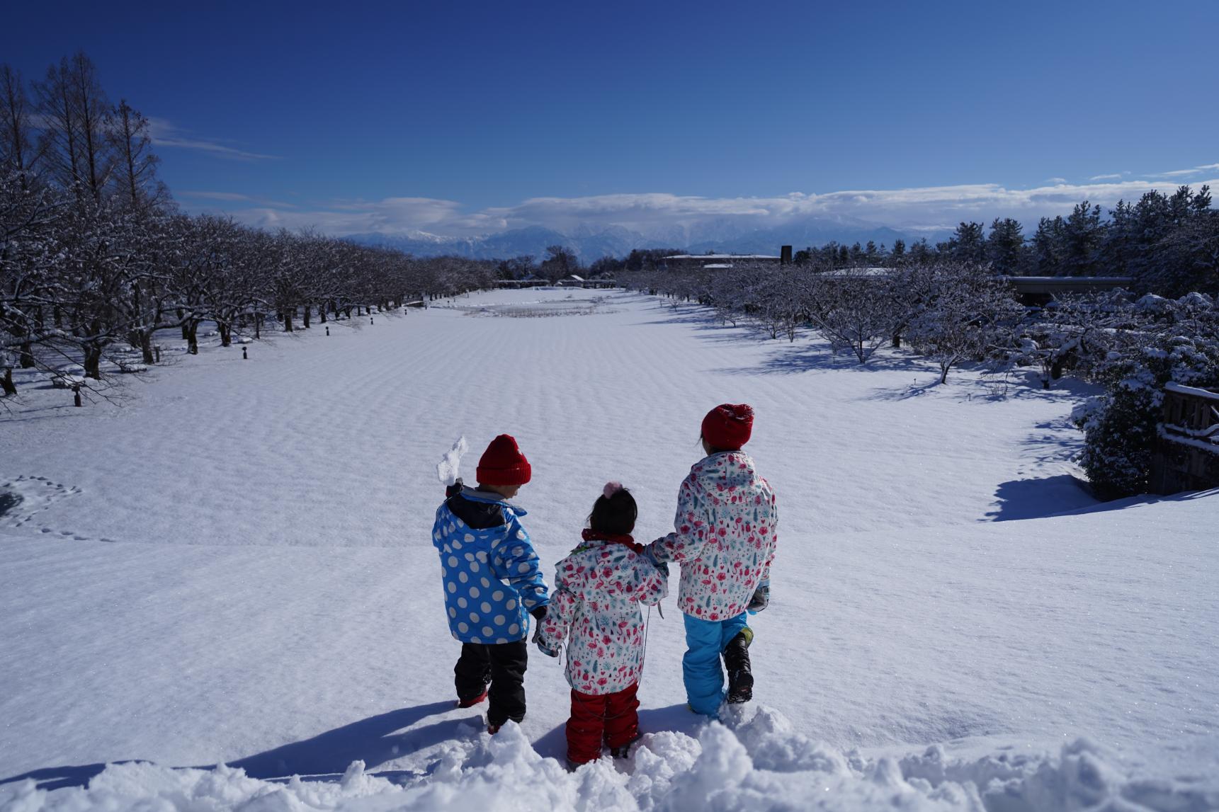 冬、咲いている花は少ないかもしれませんが、この景色を目にするだけで「来てよかった」と思えます。ここでしか見ることのできない雪景色!子どもたちの無邪気な笑い声だけがやさしく響き渡り、その空間には言葉では言い尽くせない温もりと美しさがありました。ここは、富山県を代表する、冬の絶景スポットといっても過言ではないと思います。