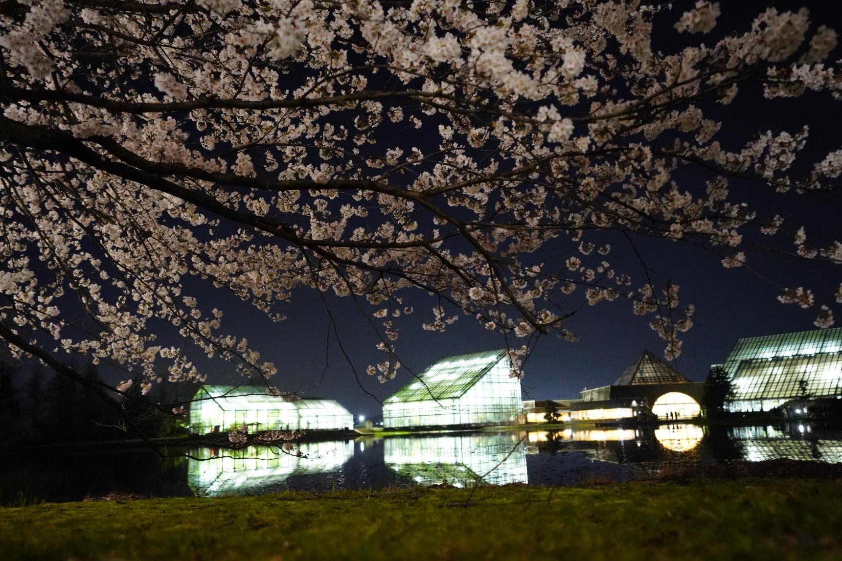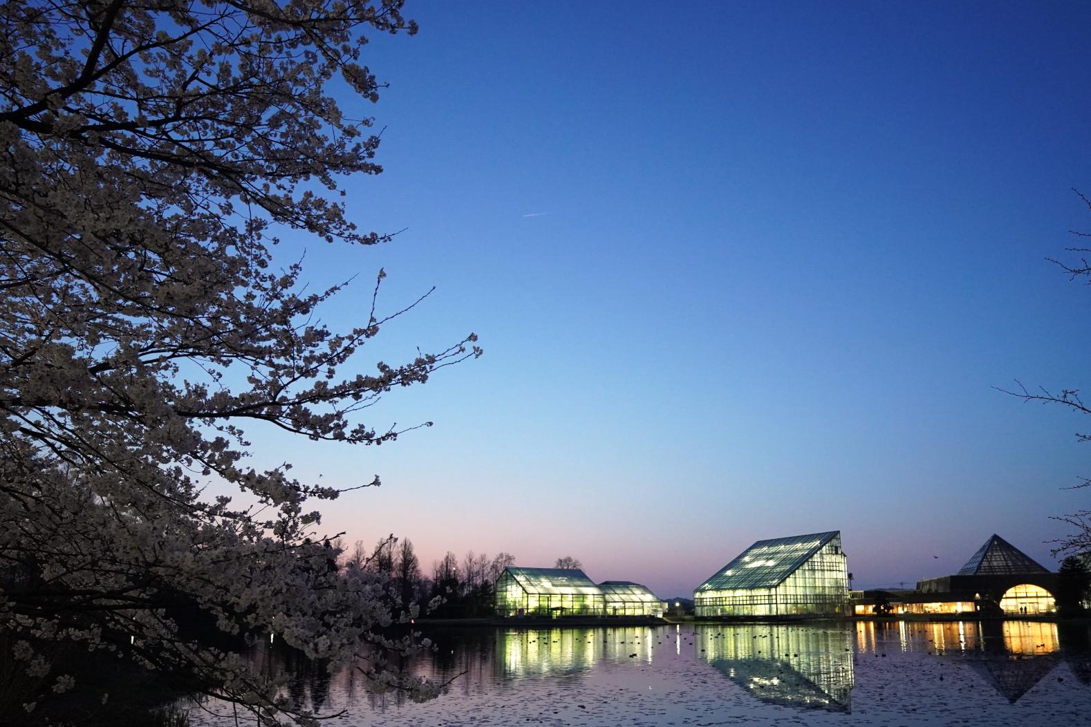 「さくらまつり」は、4月初旬の4日間のみ開催される特別なイベントです。開園時間が延長され、夕暮れから夜にかけても桜を楽しむことができます。ライトアップされた桜並木、ベンチに座って、ゆっくり眺める時間はとっても贅沢ですよ!