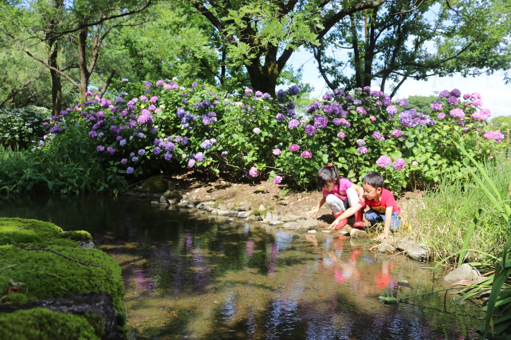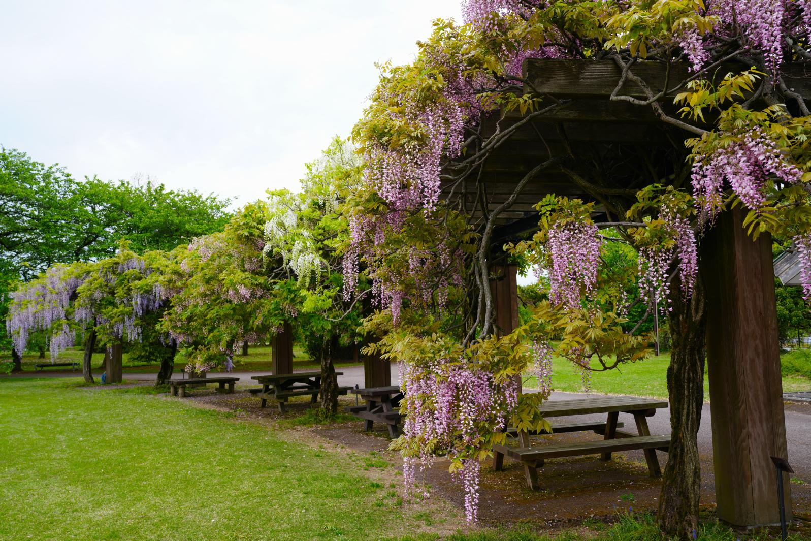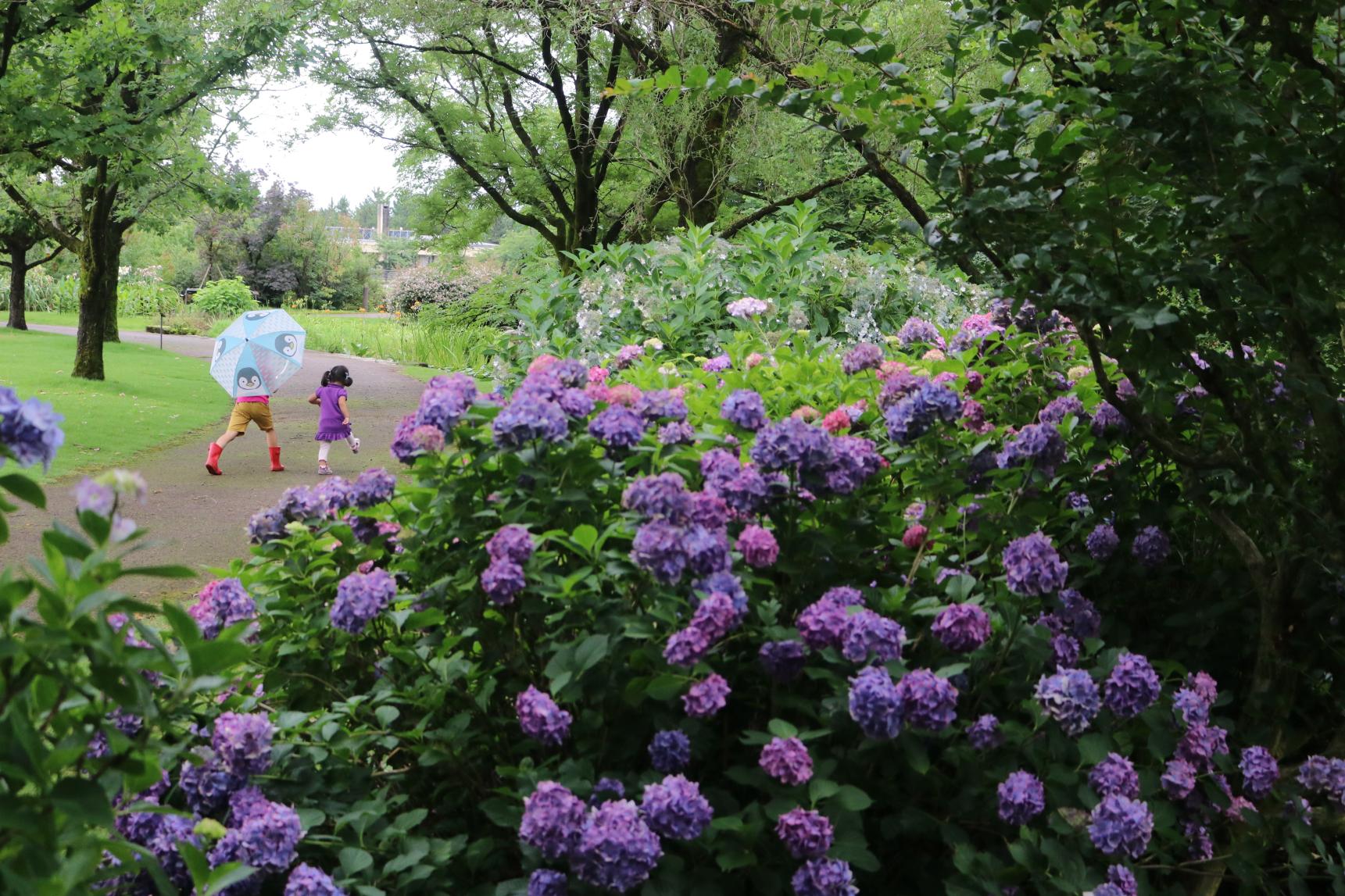 5月は、藤が見ごろを迎え、6月には、「オックスフォード庭園」の横で色とりどりの紫陽花が咲き、楽しむことができます。梅雨の時期には、雨に濡れた青や紫、ピンクの花々がきらめき、晴れの日とはまた違った、しっとりとした風情を味わえるのも魅力のひとつです。