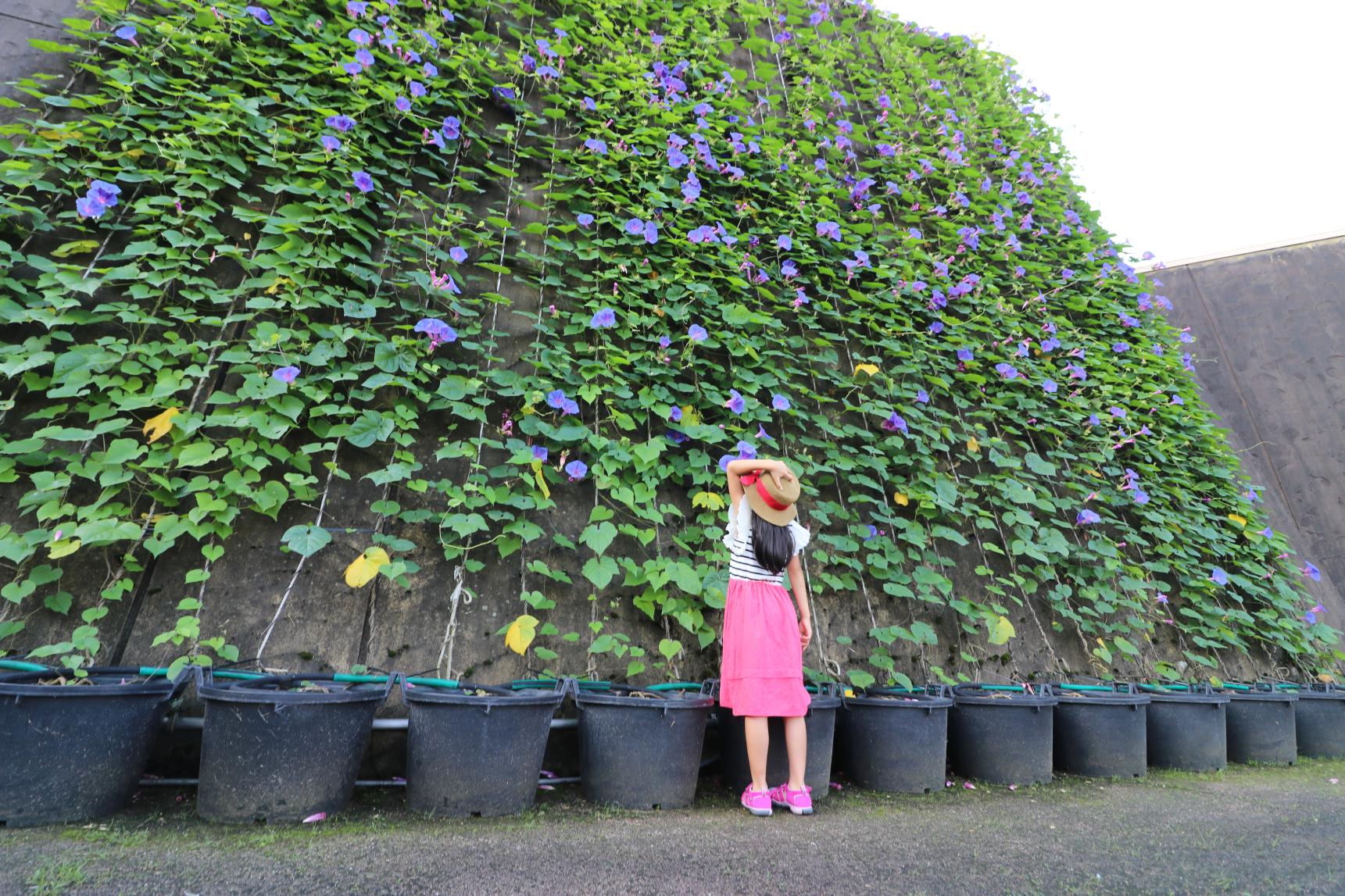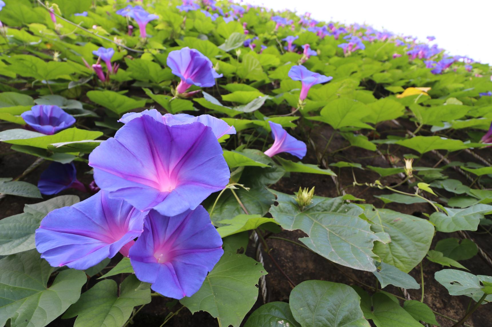 夏に見たい景色の1つ、咲き誇る「ノアサガオ」!つるを大きく伸ばしながら、たくさんの花を咲かせます。ひとつひとつの花が大きく、鮮やかな青紫色が特徴で、まさに「夏」を感じさせる花!入園すると、思わず足を止めたくなる華やかさで、楽しませてくれます。