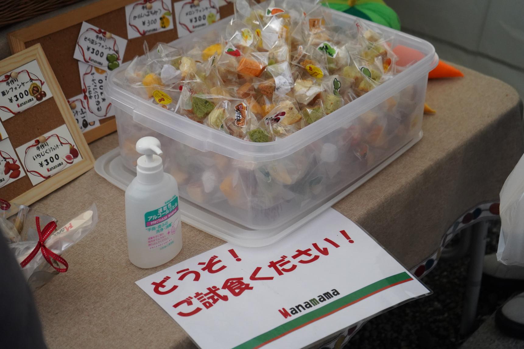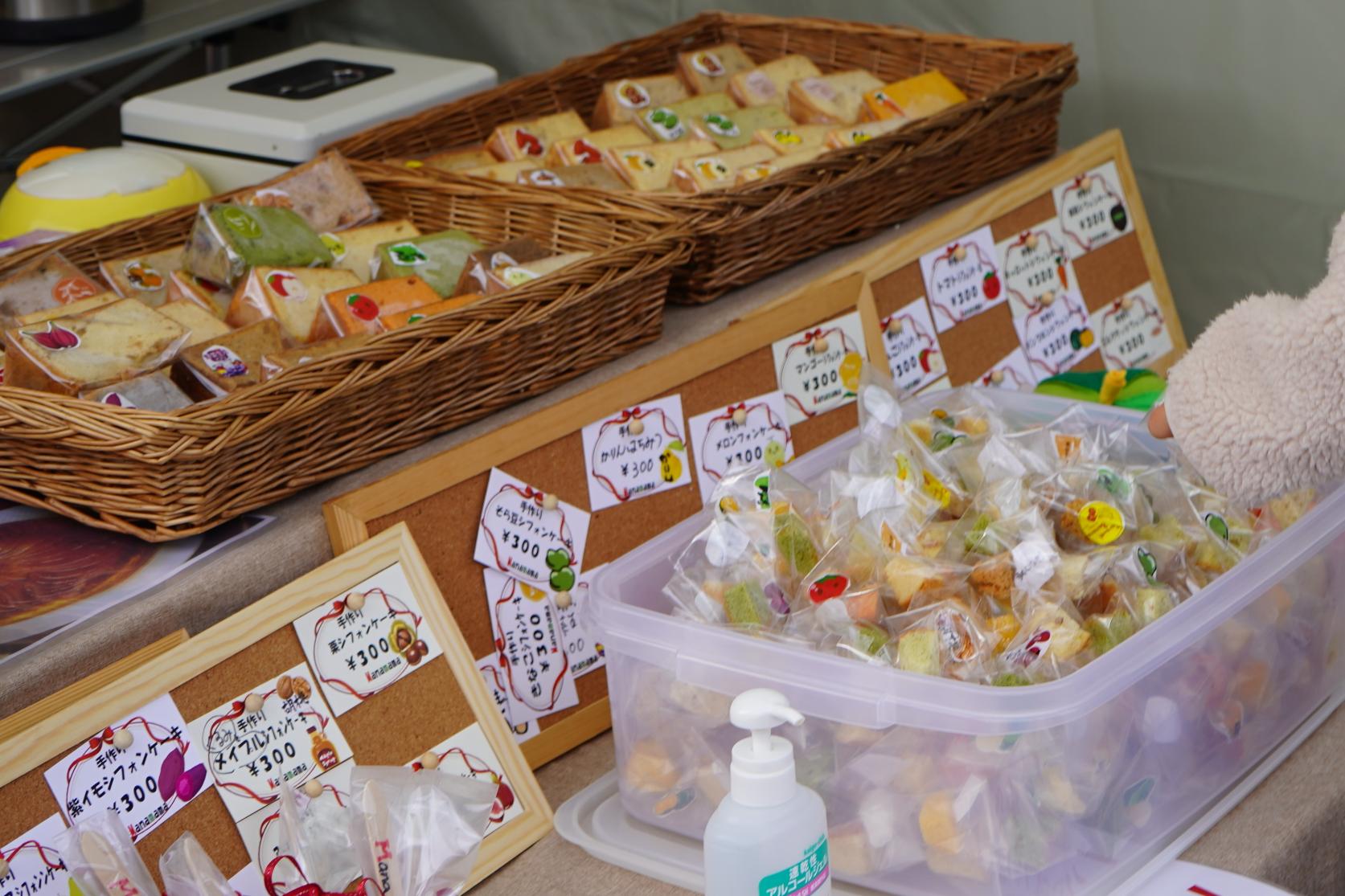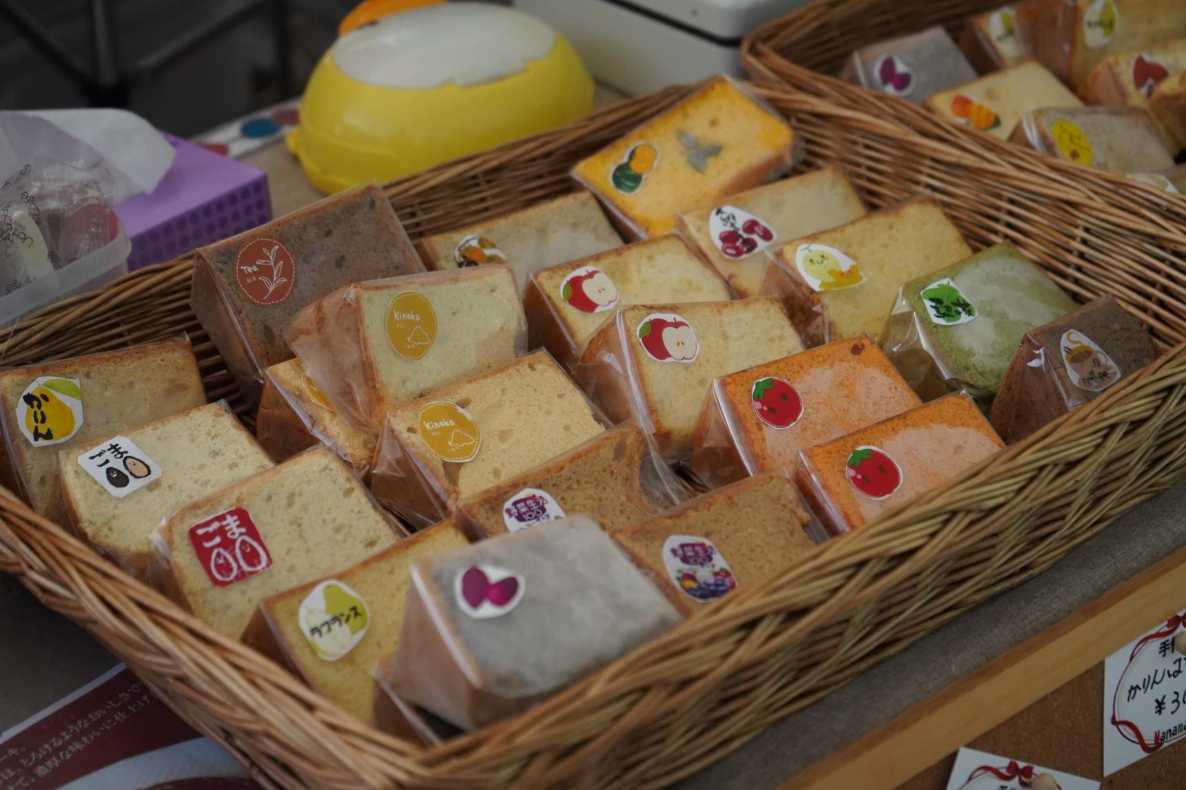 のみの市でしか買えない、ここに来ないと食べられない貴重なお店でした。季節の味を楽しめるシフォンケーキのお店。すべて無添加で作られているそうです。いったい何種類あるんだろ?と色とりどりのケーキに惹かれ、娘は、どれにしようかな?と悩んでいました。でも、そんなときでも安心してください!