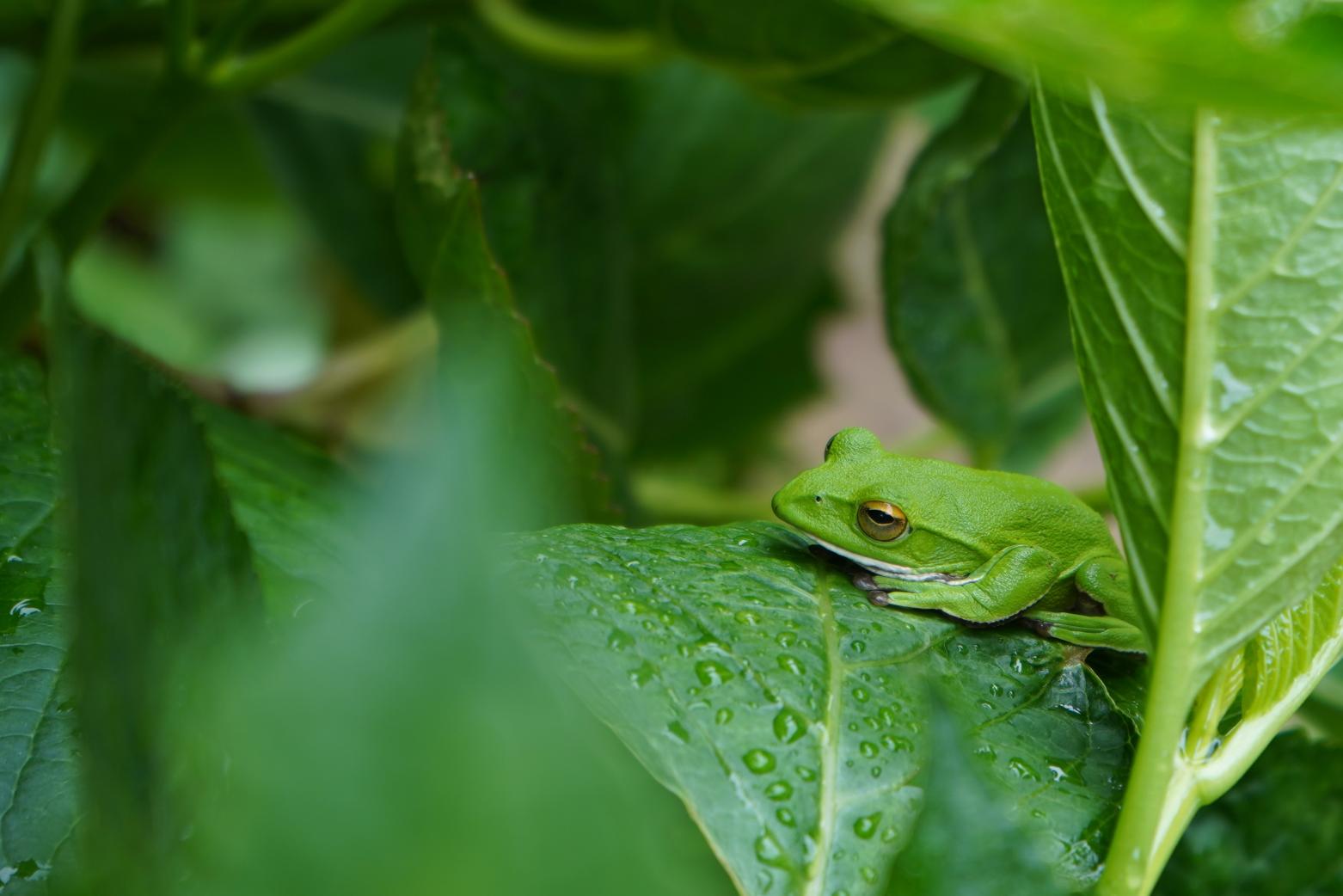 池の周辺では、あじさいも見られます。そこで見つけたのは、「モリアオガエル」です。森林に生息し、産卵期に水辺にやってきて、木の枝などに白い卵塊を産み付けます。奥のトンボ池では、この卵を見ることができます。蛍もいました。また、オタマジャクシやアメンボ、ヤゴなどたくさんの生き物も観察できました。ぜひ、探してみてくださいね。
