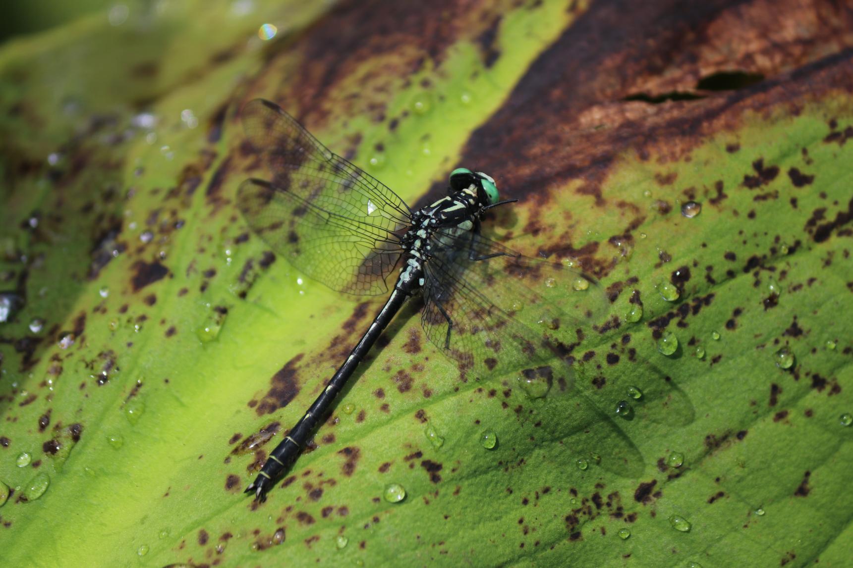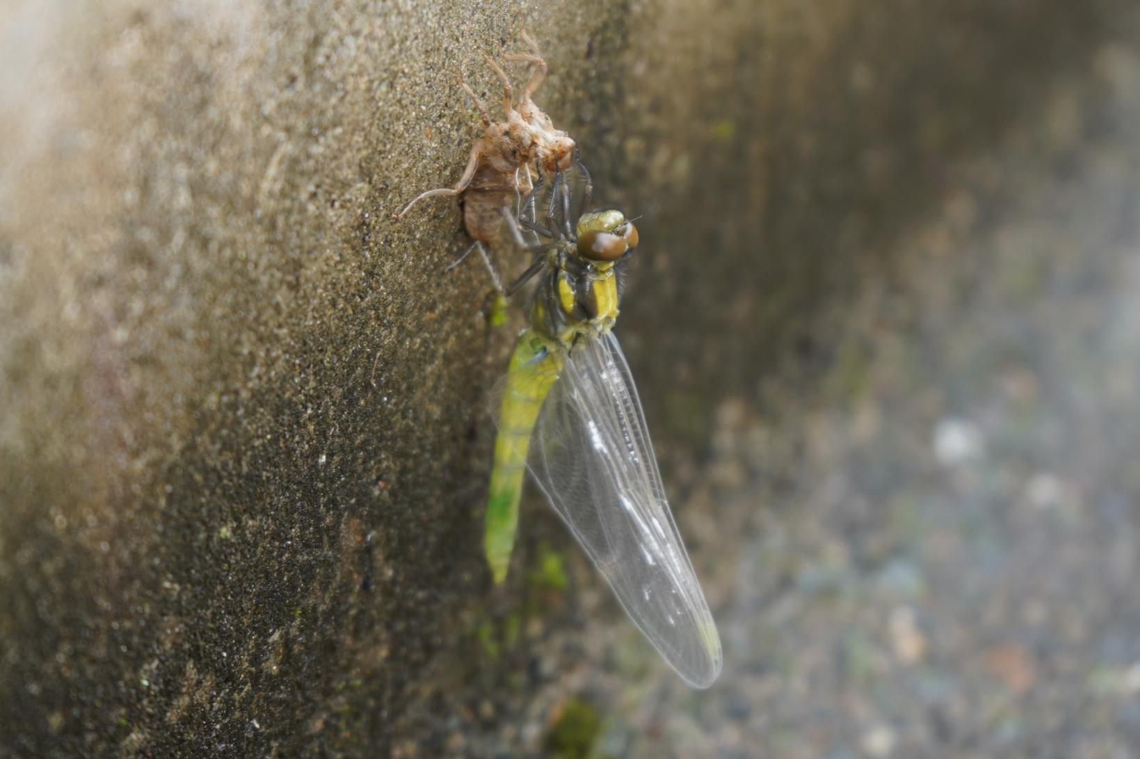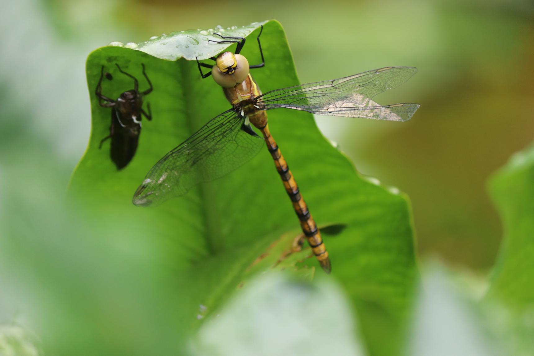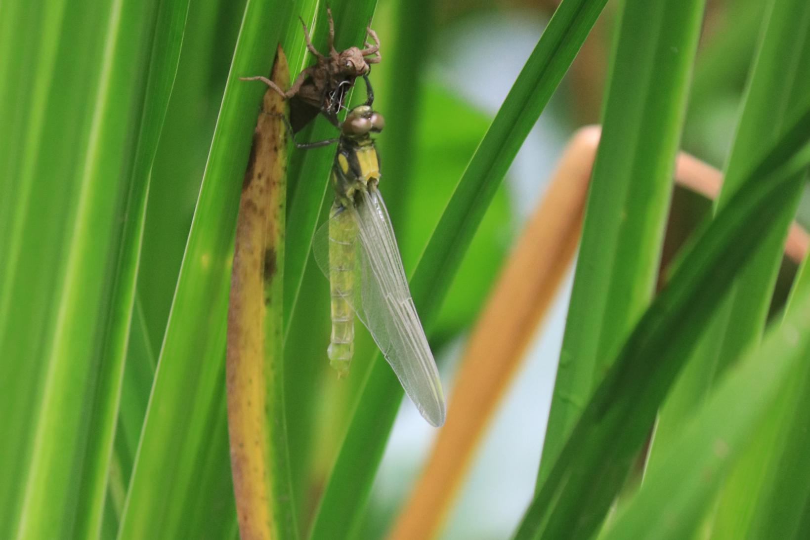 とんぼの羽化です。この日は、ここで羽化をしている姿を見つけ、子供たちは、興味津々でした。「トンボ池」周辺で羽化している姿を過去、数回見つけることが出来ました。葉などの裏を観察すると見つけられるかもしれません!