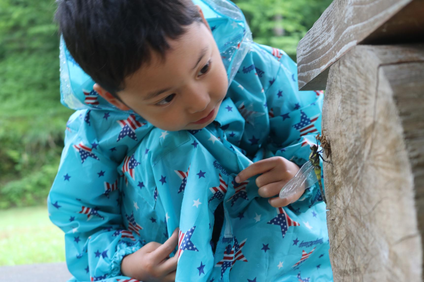 ゴール地点に到着!ゴール地点には休憩所もあり、座って一息つくことも出来ます。子供たちは、「トンボ池」の散策に夢中になっていました。ここ、「トンボ池」には、モリアオガエル、モリアオガエルの卵、オタマジャクシ、カエル、カメなど、たくさんの生き物を発見しては観察していました!そして、子供たちの注目の的は…。