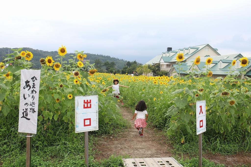 クアガーデン、青い空、白い雲を背景にひまわりが映えていました。ひまわり畑には、入口と出口という看板が立ち、迷路が作られています。子供たちは、夢中になって、挑戦!楽しめますね。