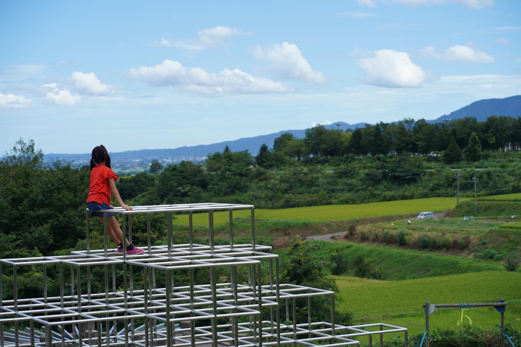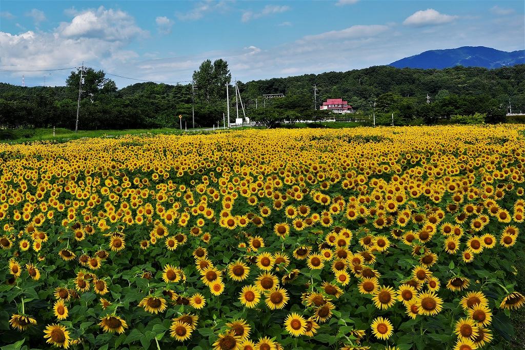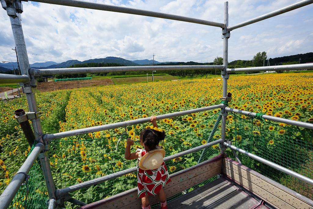 簡易的な展望台ですが、そこから見えるひまわり畑は圧巻です。里山に囲まれ、夏の雰囲気を十分に感じることが出来ます。小さいお子様でも、安全にひまわりが見られるように柵が設置してありました。