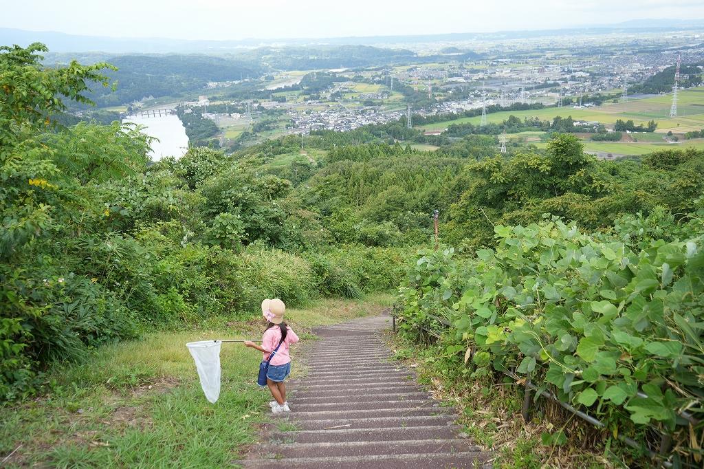 車でキャンプ場よりさらに坂道を登ると、バーベキューハウスがあります。そこが駐車場です。車から降りたら、頂上まで階段が続きます。山頂からの絶景を楽しみにぜひ登ってみてください!子供たちはあっという間に登ります。早い時は約5分ほどです。ゆっくり登っても15分ほどで山頂に着きます。3、4歳のころから自分の足で往復できていた記憶があります。小さいお子様も一緒にぜひ!