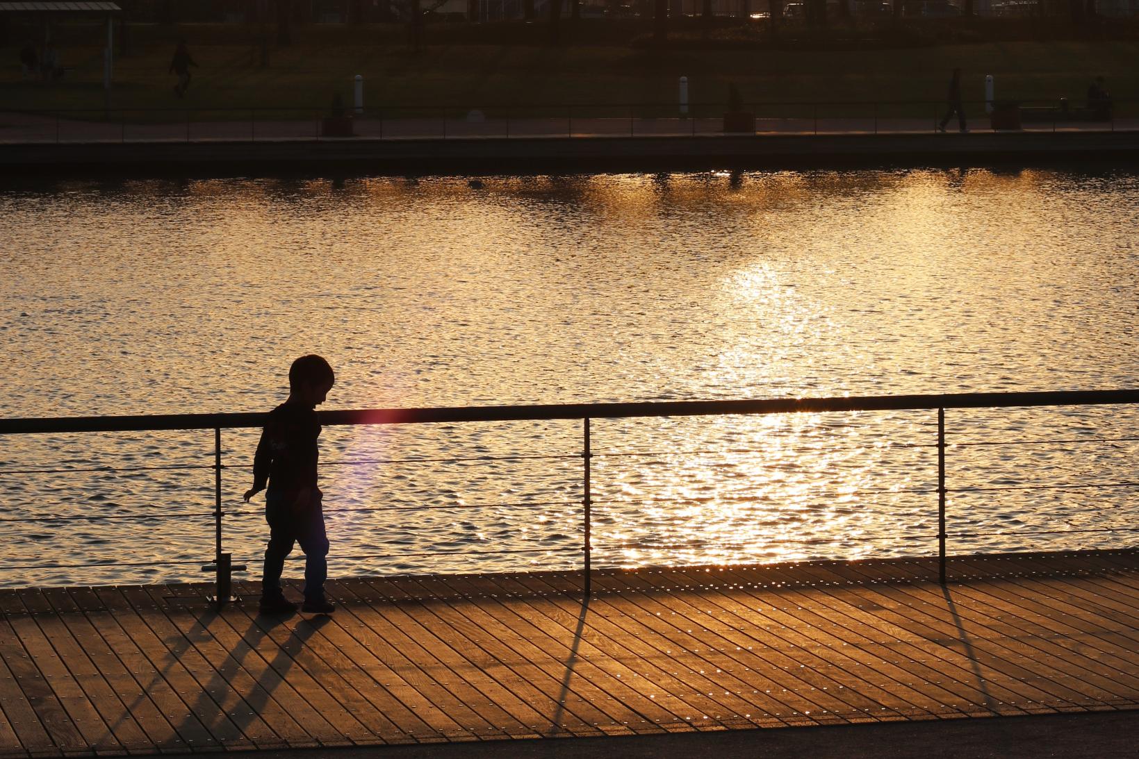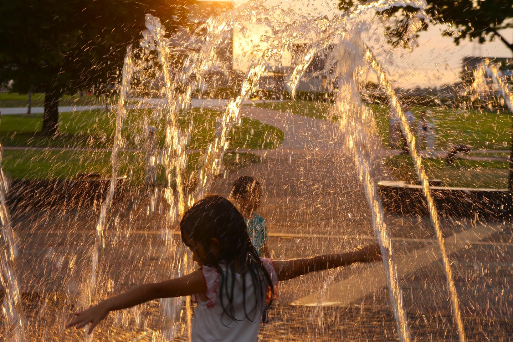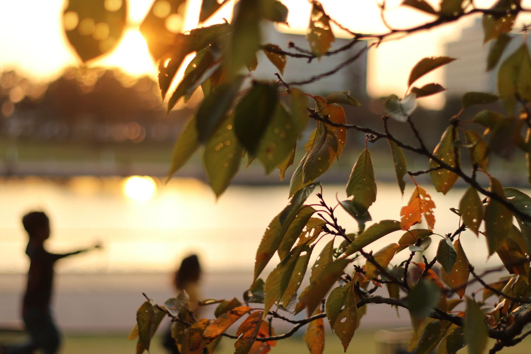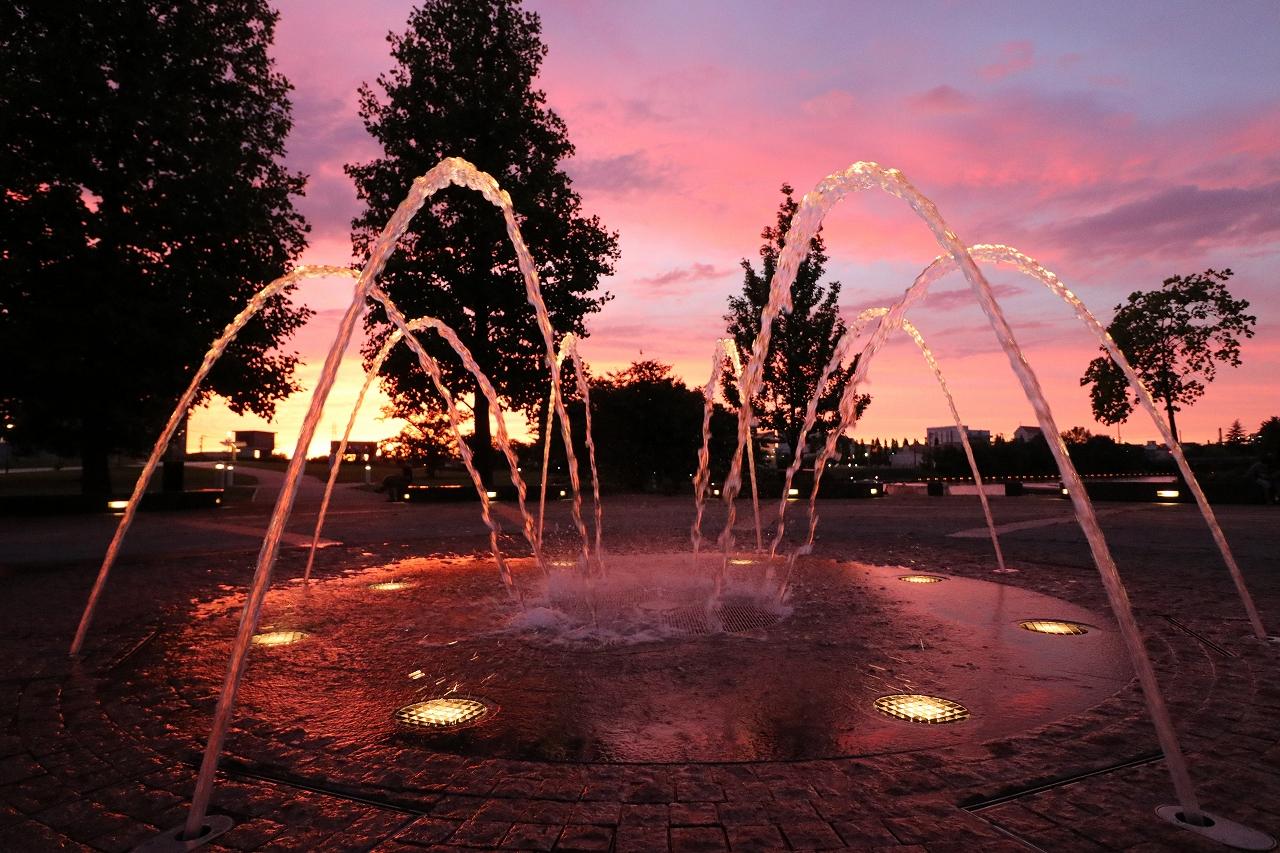 夏は、緑あふれる中、たくさんの子供たちが水遊びに夢中になっているのが印象的です。また、梅雨の晴れ間、美しい夕焼け空にも出会うことが出来ました。6月から8月にかけて、噴水に夕陽があたり、日中とは違う雰囲気が感じられます。暑い夏でも、涼しくなる夕方に訪れるのもオススメですよ!