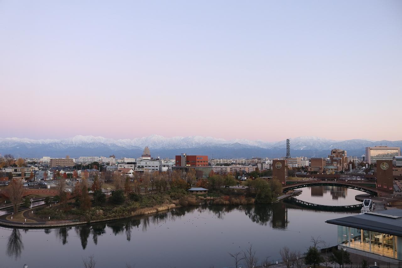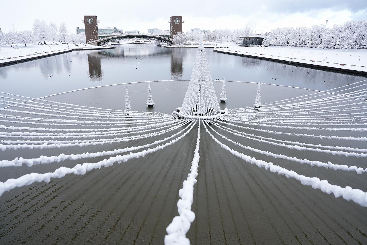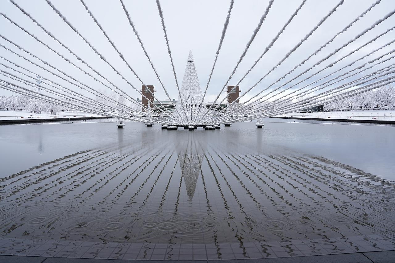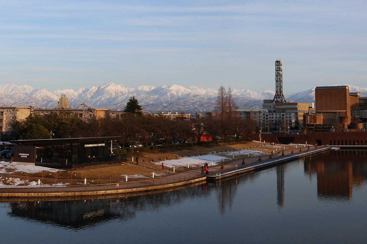雪景色もなんとも言えない環水公園。真っ白く染まった公園一帯は、寒さを忘れさせてくれる景色です。また、天門橋は、「立山あおぐ特等席」に認定されており、雪の立山連峰と環水公園のコラボは絶景です!