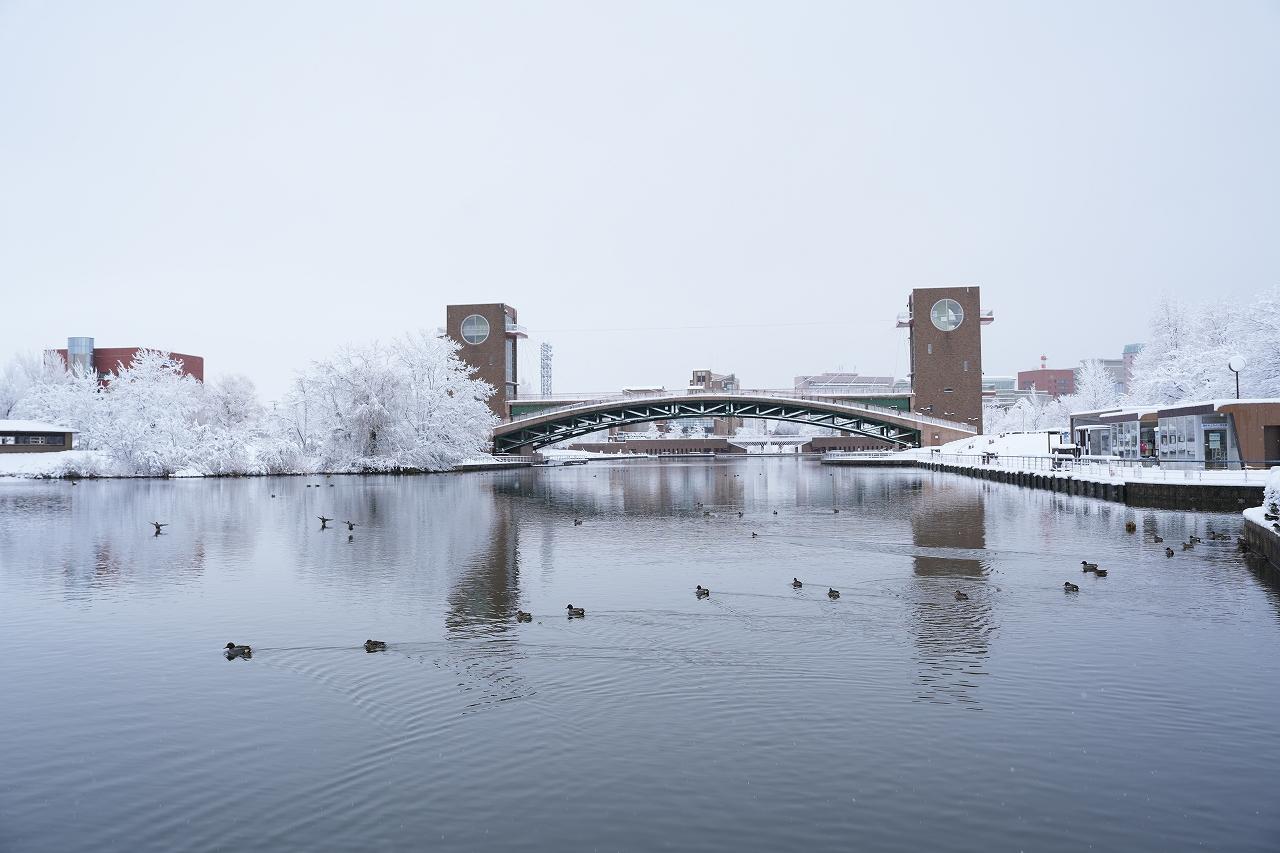 「環水公園」から約2キロ。運河沿いはお散歩コースに最適です。ぜひ、「中島閘門」まで足を運んでみてくださいね。