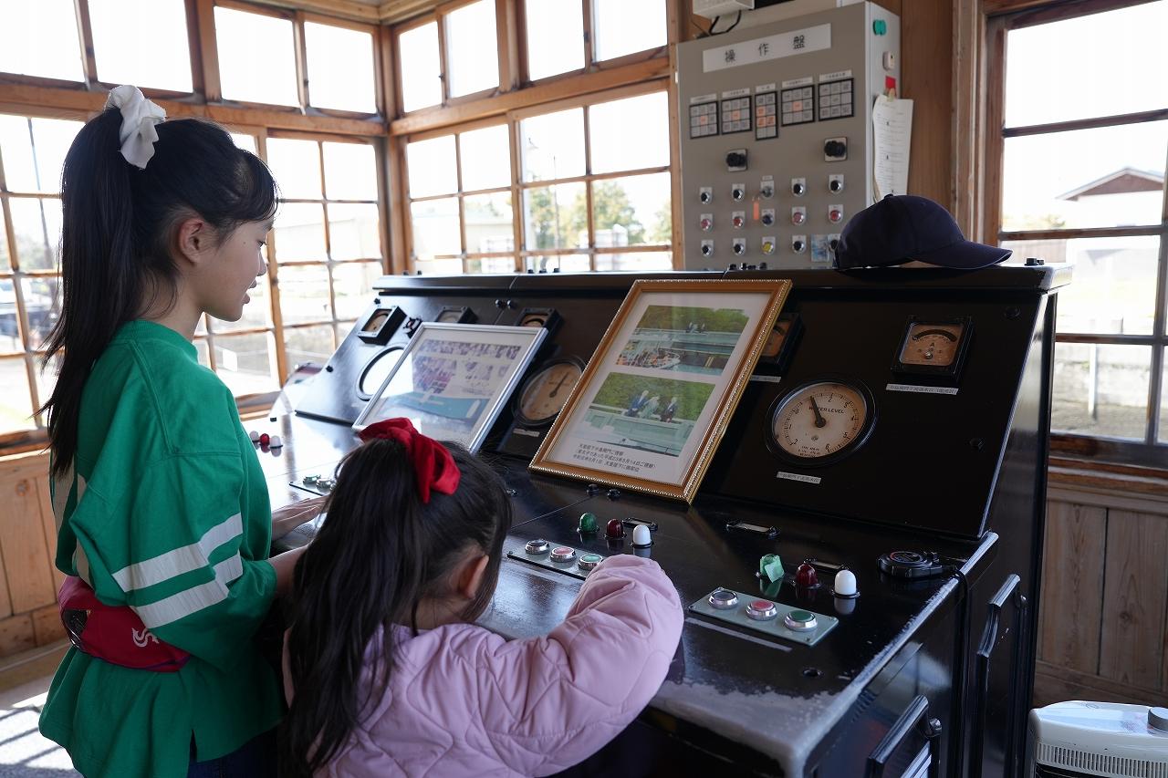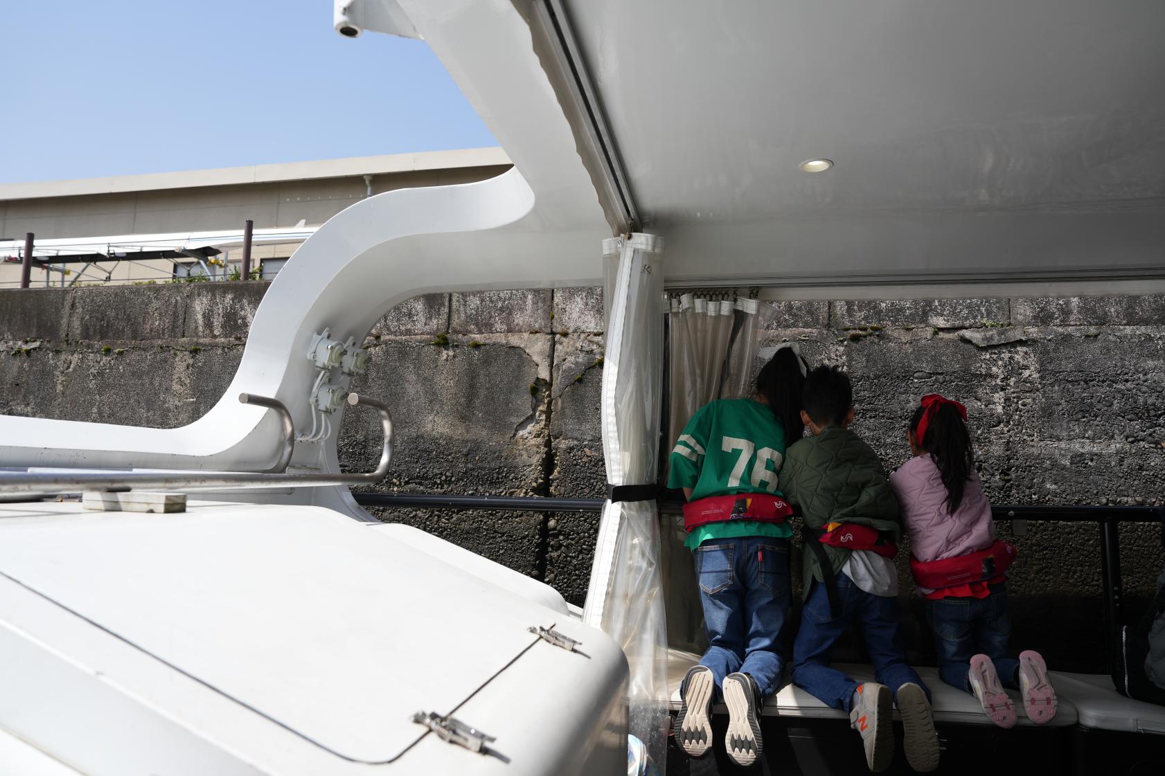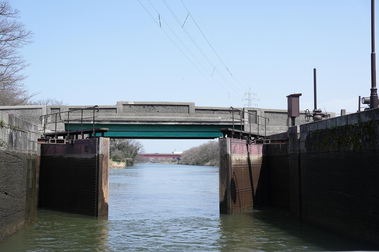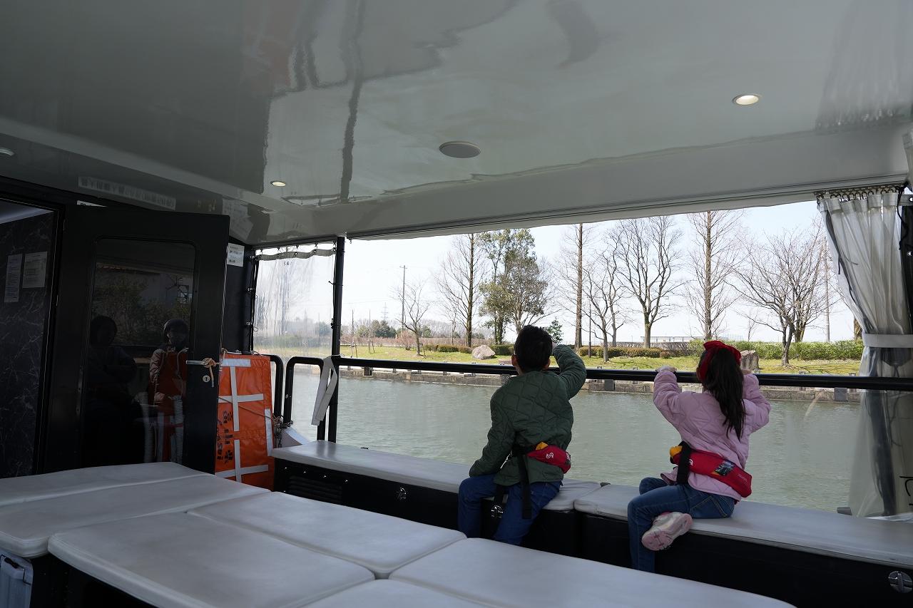 「中島閘門」を通過するとき、水位を調節しなければいけないことを知りました。2.5mの水位を両扉で調節し、船を通過させます。子供たちも興味津々!