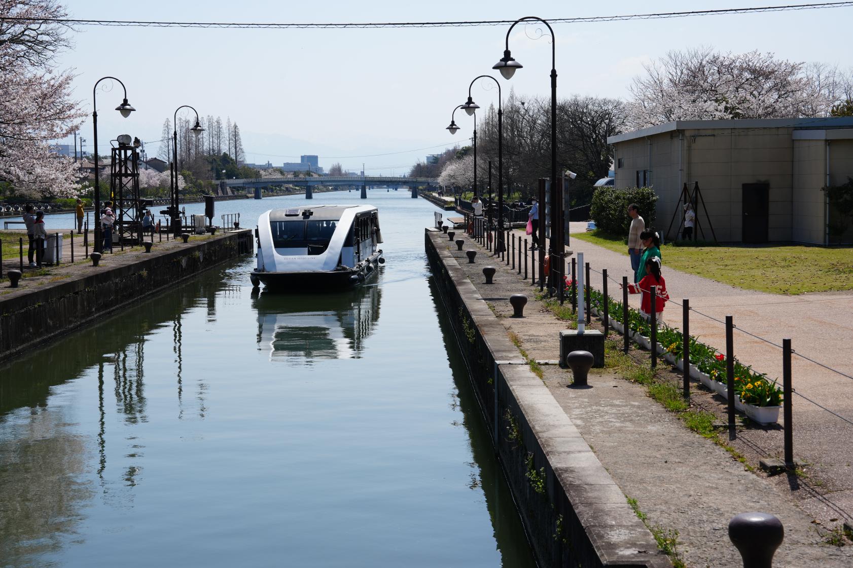 桜やチューリップが咲き、春を感じられる素敵な場所でした。また、「中島閘門」は、船の中からだけではなく、周辺からも見学できます。