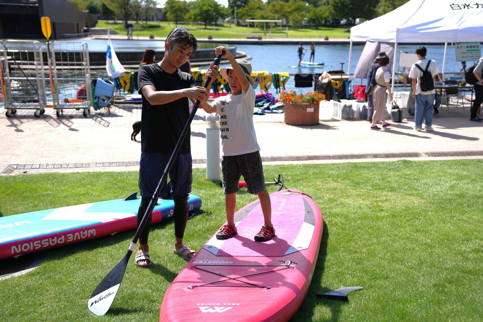 「環水公園の日」(概ね第3日曜日・4月~11月)に合わせて、白水カヌークラブによる、カヌーとサップが体験できるイベント(説明10分・体験15分)が開かれています。小さいお子さんから親子でも楽しめるイベントです。