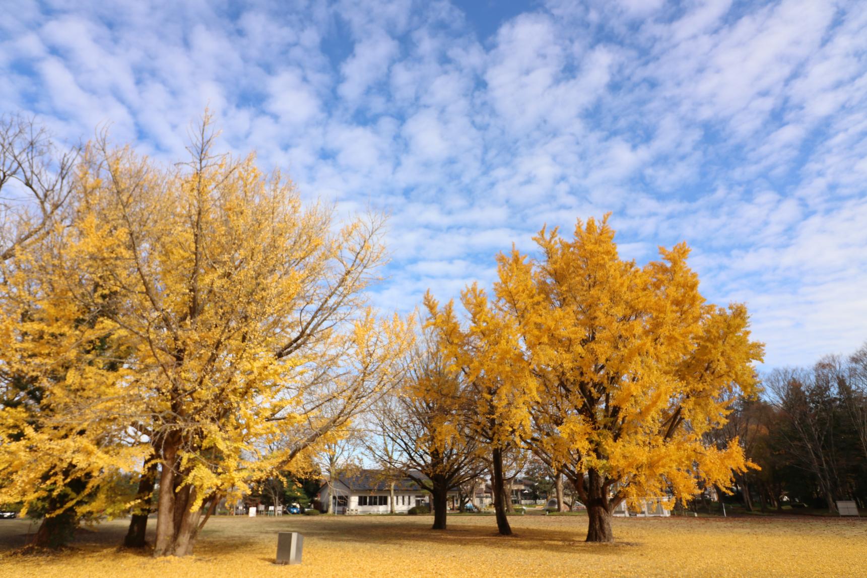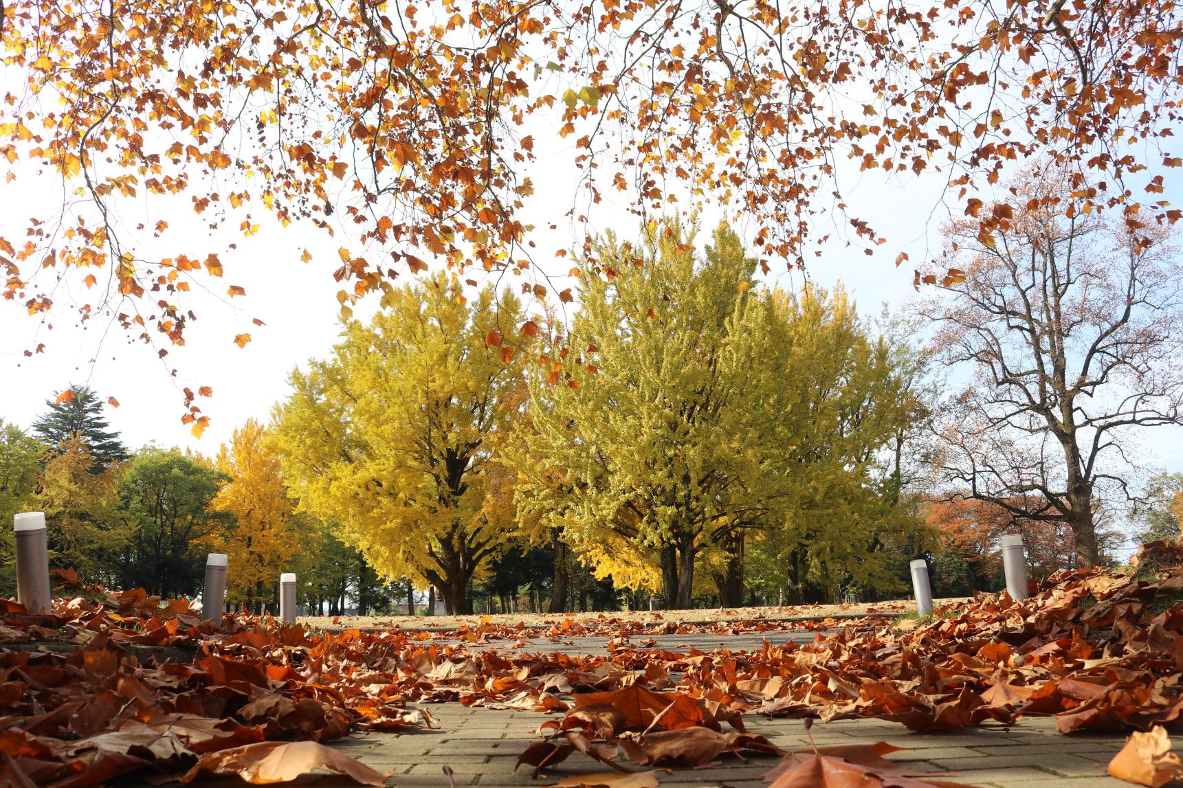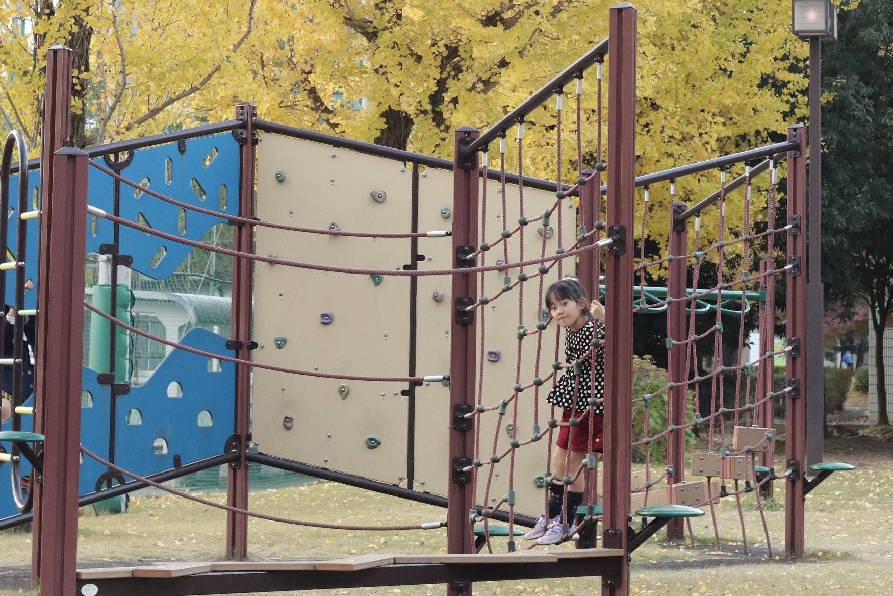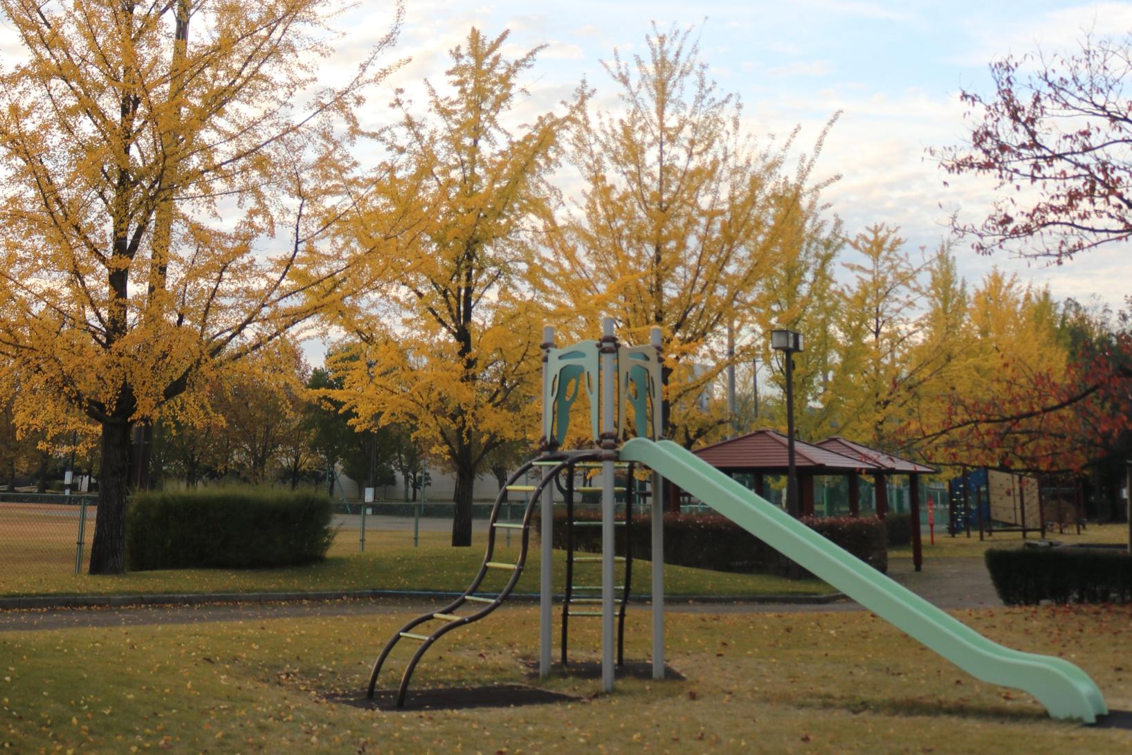 遊具の周りには、銀杏の木々があるため、ここも絨毯が広がります。また、公園からは夕暮れも見ることが出来ます。日中、思いっきり遊ぶのもよし、夕暮れとライトアップを楽しむのもよし、見どころ満載の公園です。