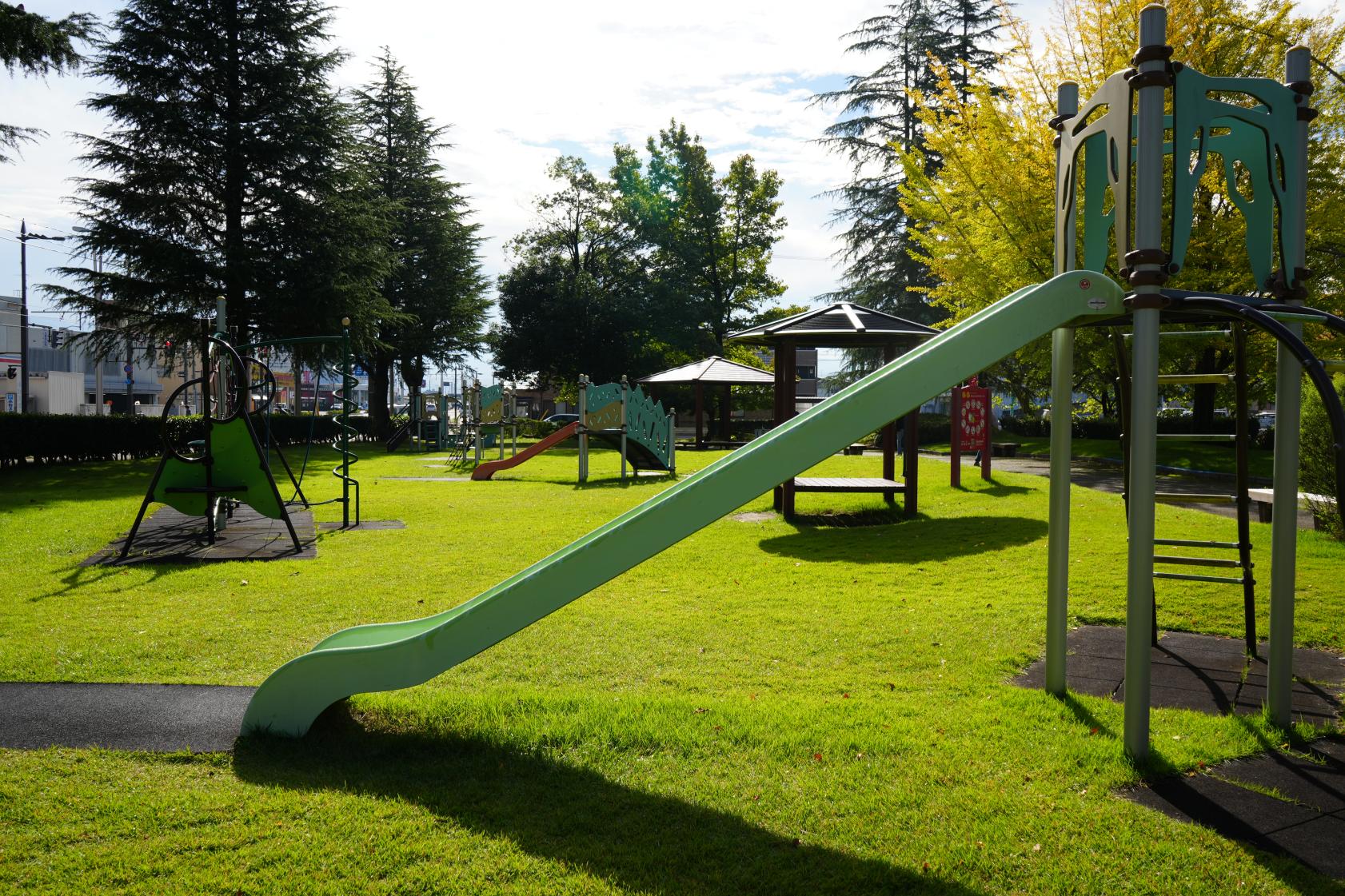 遊具の周りは、桜や銀杏の木々があり、公園で遊びつつ、紅葉を楽しむことが出来ます。野球広場や陸上競技場などがあり、とても広く、遊具だけではなく、野球広場を1周するお散歩コースもオススメです。お散歩コースには、銀杏並木が続き、夜はライトアップもされます。五福公園の隣には、大型ショッピングセンター「アリス」もあり、スーパーやパン屋さんが入っています。