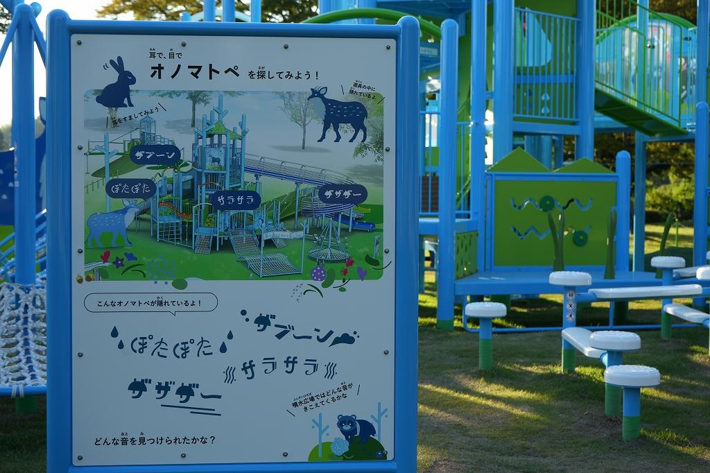 小さいお子様から、小学生まで楽しめる遊具でした。また、「耳で、目でオノマトペを探してみよう!」という看板も。探しながら遊ぶのも、面白そうです!
