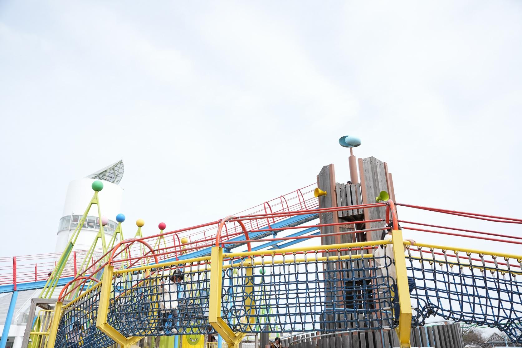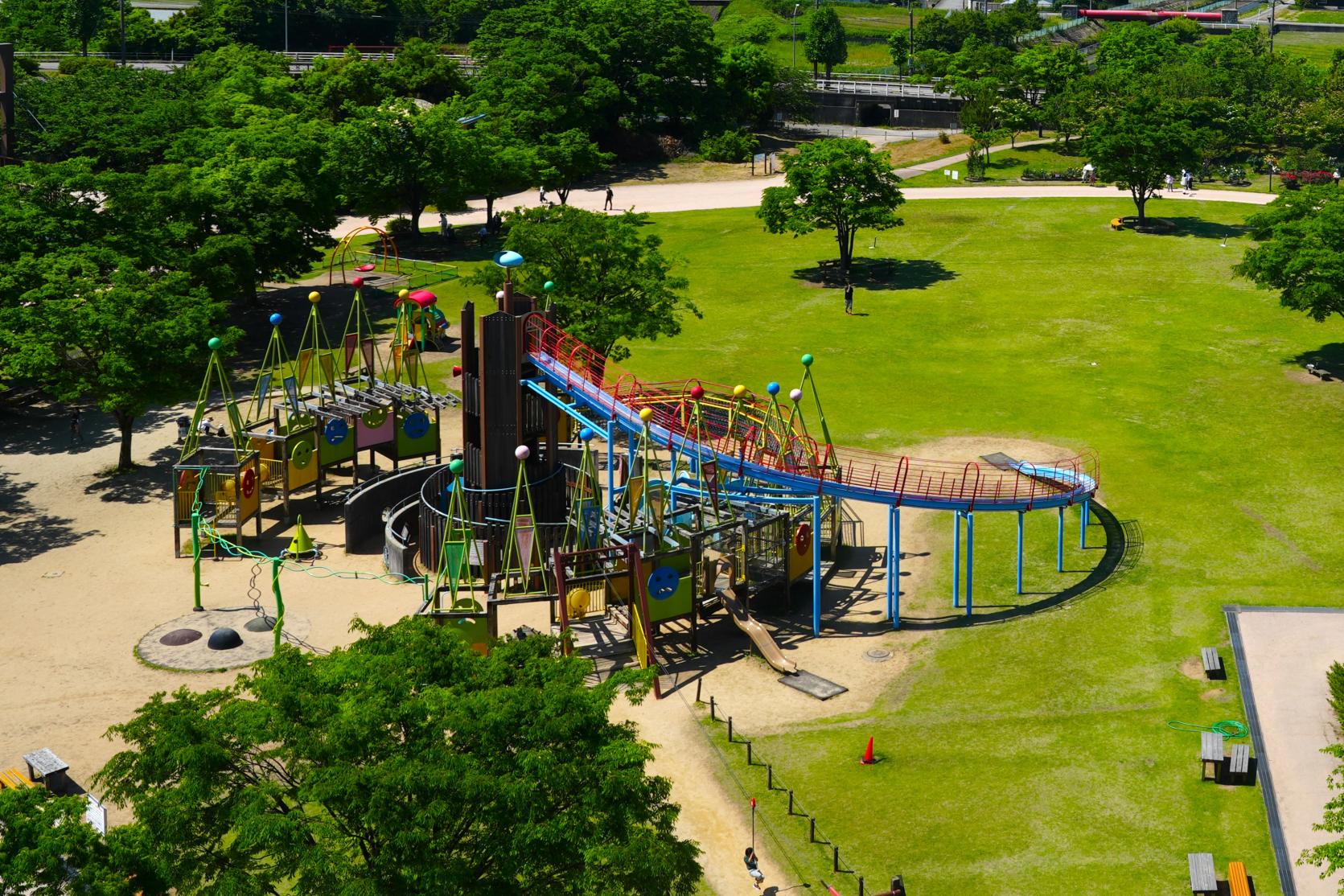 大きなローラー滑り台、大型ネット、ターザンロープなど様々な種類で構成されている大型総合遊具では、4・5歳のお子様から小学生くらいまで、思う存分、楽しめます。遊具の一番上から絶景を見渡し、滑り降りてくるのは、気持ちがいいですよ!ぜひ、安全に楽しんでくださいね。また、近くには小さいお子様専用の遊具や広い芝生広場もあるので、ご家族で楽しめること間違いなしです。