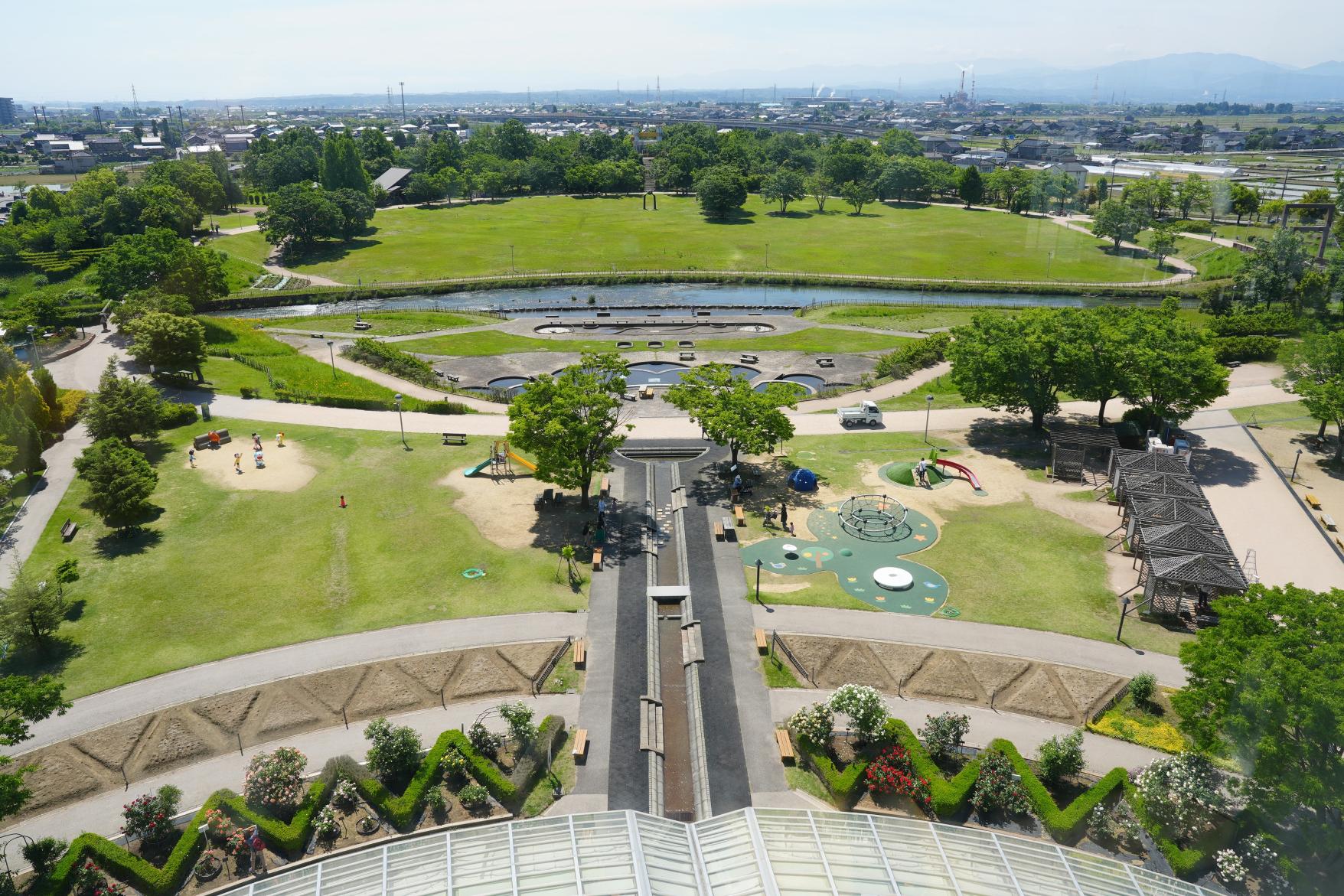 展望台からの景色は、ずっと眺めていられる絶景です。天気がいい時は、公園内だけではなく、遠くの立山連峰も一望できます。また、子供たちに大人気の「北陸新幹線」も見ることができ、大喜び!公園を訪れた際は、ぜひ、展望台にも行ってみてくださいね。