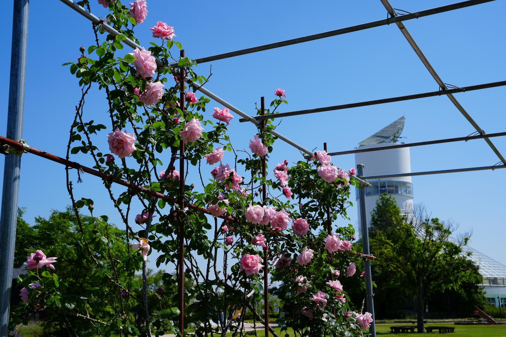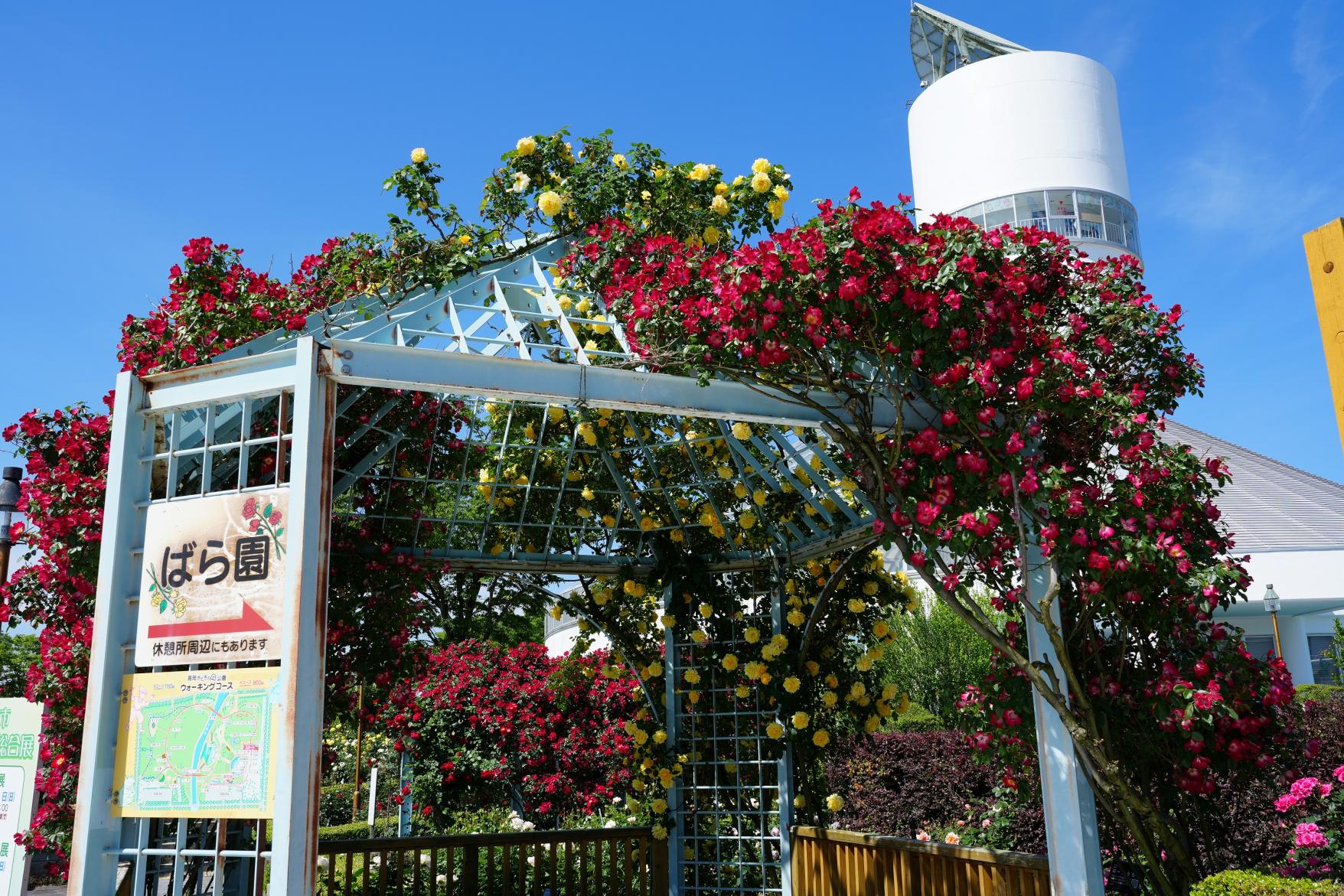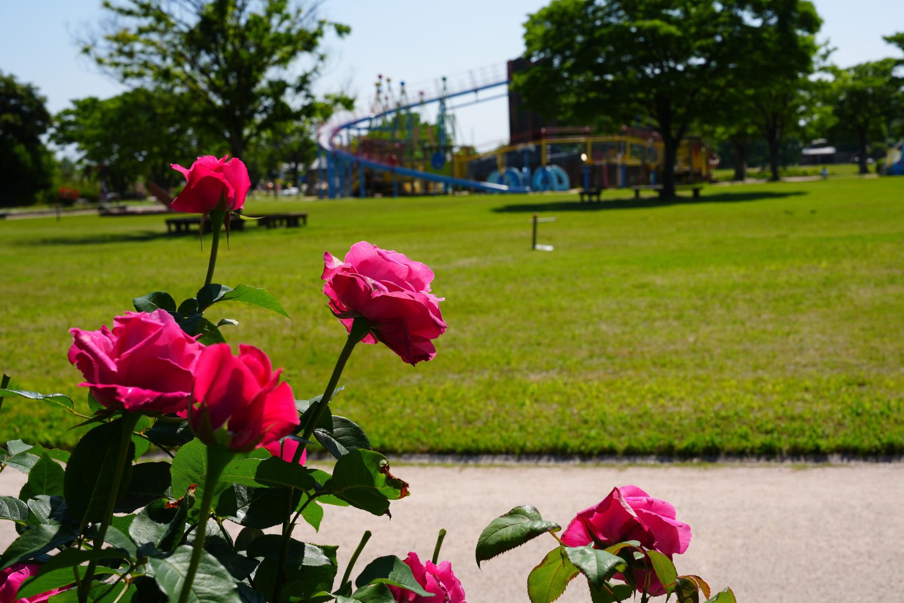 例年、5月と10月にバラが見頃を迎えます。西側駐車場から大型総合遊具のハイキングコース沿いには、たくさんの種類のバラが咲き誇ります。写真は、5月に行ったときに撮影しました。青空の元、赤やピンクのバラなどが映えていました。春と秋には、「おとぎの森館」でバラの展示会も開かれ、大勢の方が訪れます。公園で遊ぶだけではない魅力もある公園なのです!