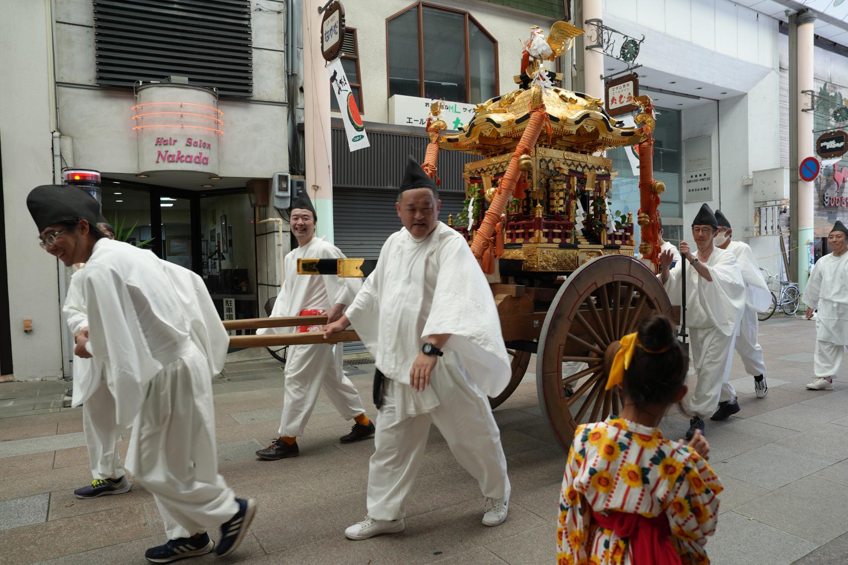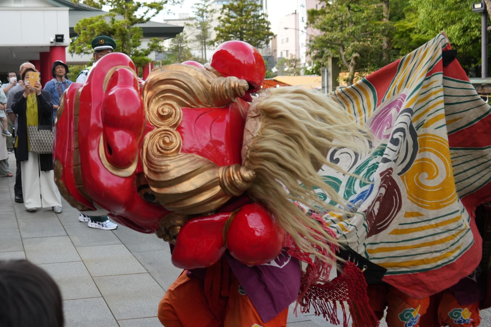 「神輿渡御(みこしとぎょ)」は5月31日と6月1日の2日間にわたって巡行されます。1日の午前中には、総曲輪通り(そうがわどおり)のアーケードにてその様子に遭遇することができました。この神輿の始まりは、富山藩二代藩主・前田正甫が日枝神社に神輿を寄進したことに由来すると伝えられています。神職や氏子たちが家内安全や商売繁盛を祈願しながら、家々を一軒ずつまわるという地域とのつながりを感じられる、温かな伝統が今も息づいているお祭りだと思います。また、2023年には4年ぶりに獅子舞も復活!街中を練り歩く様子も見ることができます。