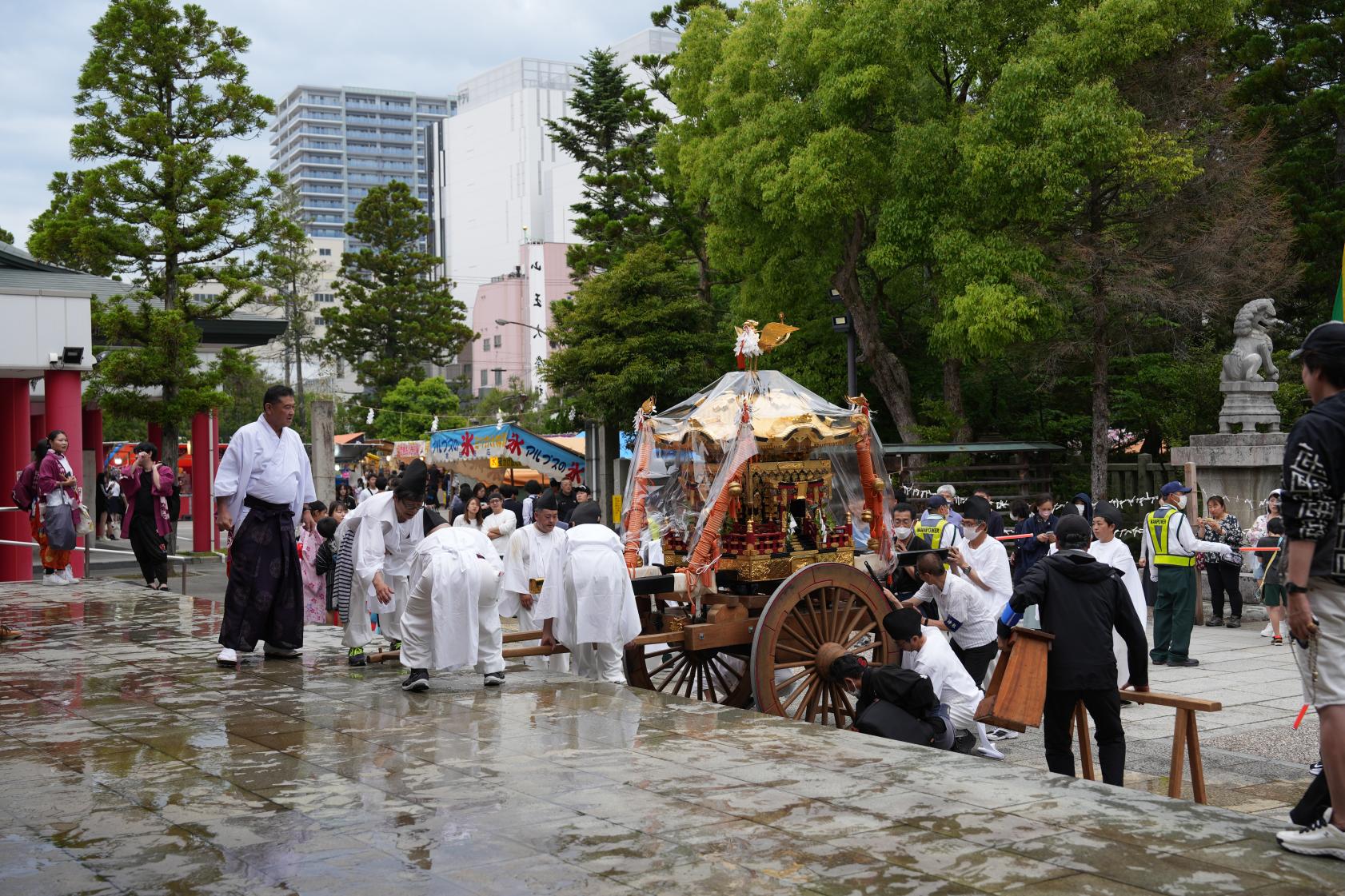 神輿や獅子舞、そして、子供たちもワクワクする露店!露店の数は、なんと約700店!前夜祭に始まり、神輿の巡行など、毎年5月31日~6月2日に開催されています。