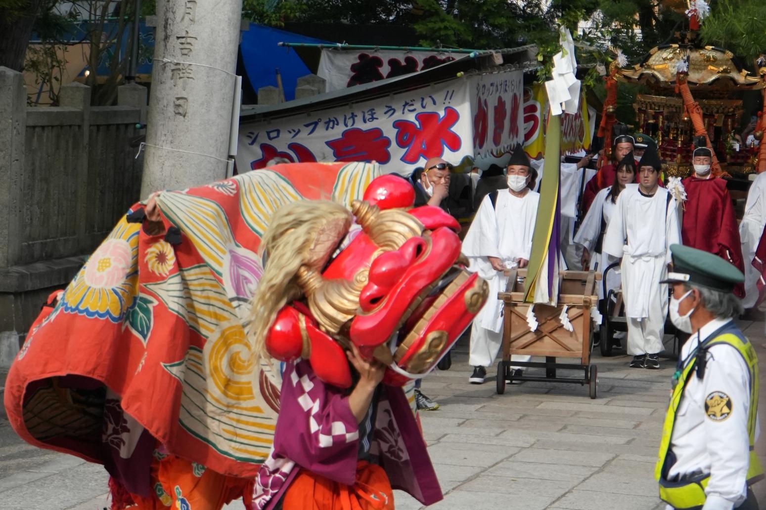 巡行を終えた神輿は、17時ごろには神社へと帰ってきます。夕方、17時頃になると、露店の間をかき分けるように大きな掛け声が響き、笛の音や力強い太鼓の音が鳴り渡ります。その光景は、多くの人々を惹きつけ、お祭りを一層活気づけているように感じました。獅子舞が間近に迫ってくる様子はとても迫力がありました。