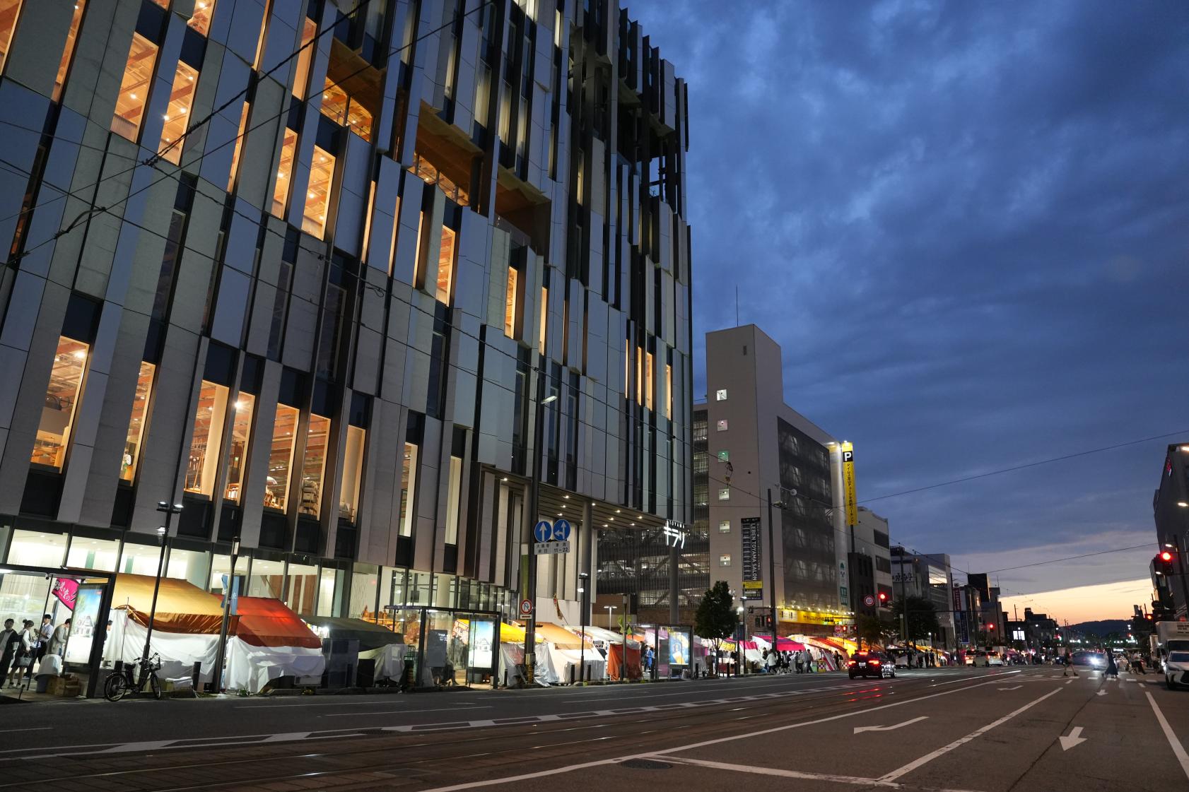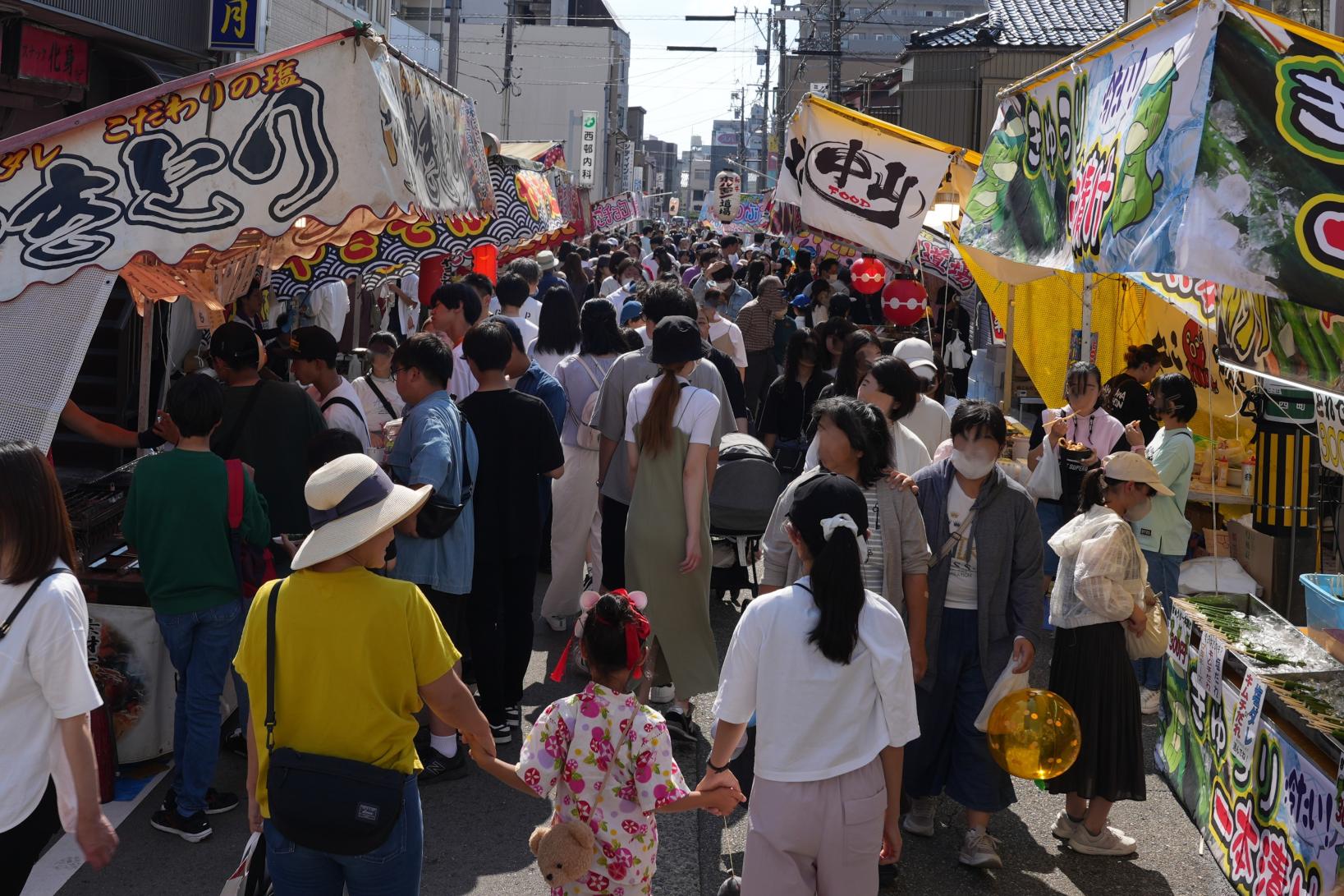 祭り期間中はなんと約700店のも露店が日枝神社を中心に並びます。日枝神社周辺の路地はもちろん、ガラス美術館周辺からグランドプラザにも、多彩な屋台が所狭しと並び、まさに富山県を代表するお祭りという雰囲気です。写真は、2024年6月1日15時ごろの様子です。家族連れやカップルなど、たくさんの人々で賑わっていました。夕方以降はさらに人出が増し、夜になると屋台の灯りと神社の明かりが幻想的に浮かび上がり、まさに「お祭りの象徴」とも言える光景が広がります。
