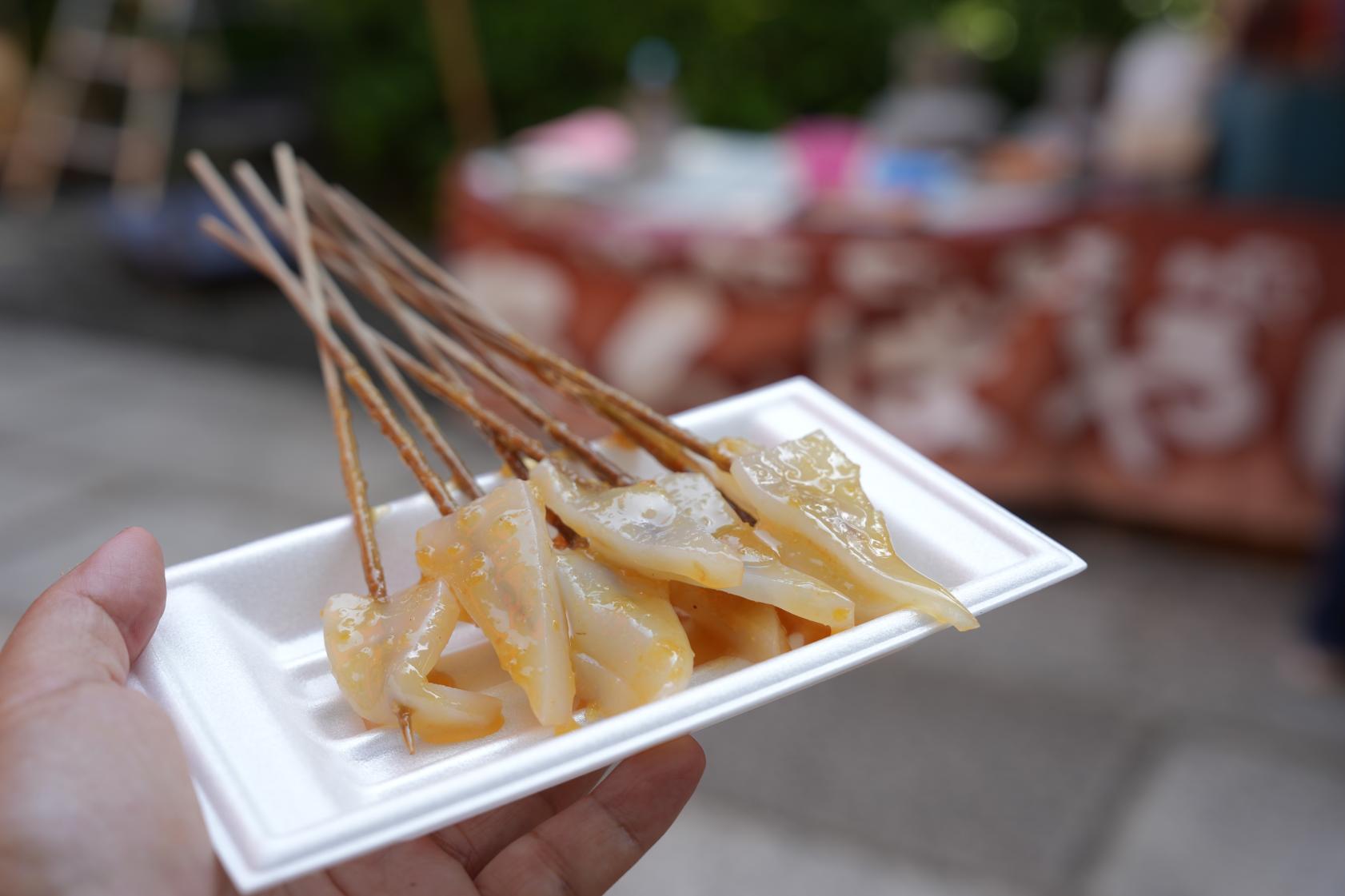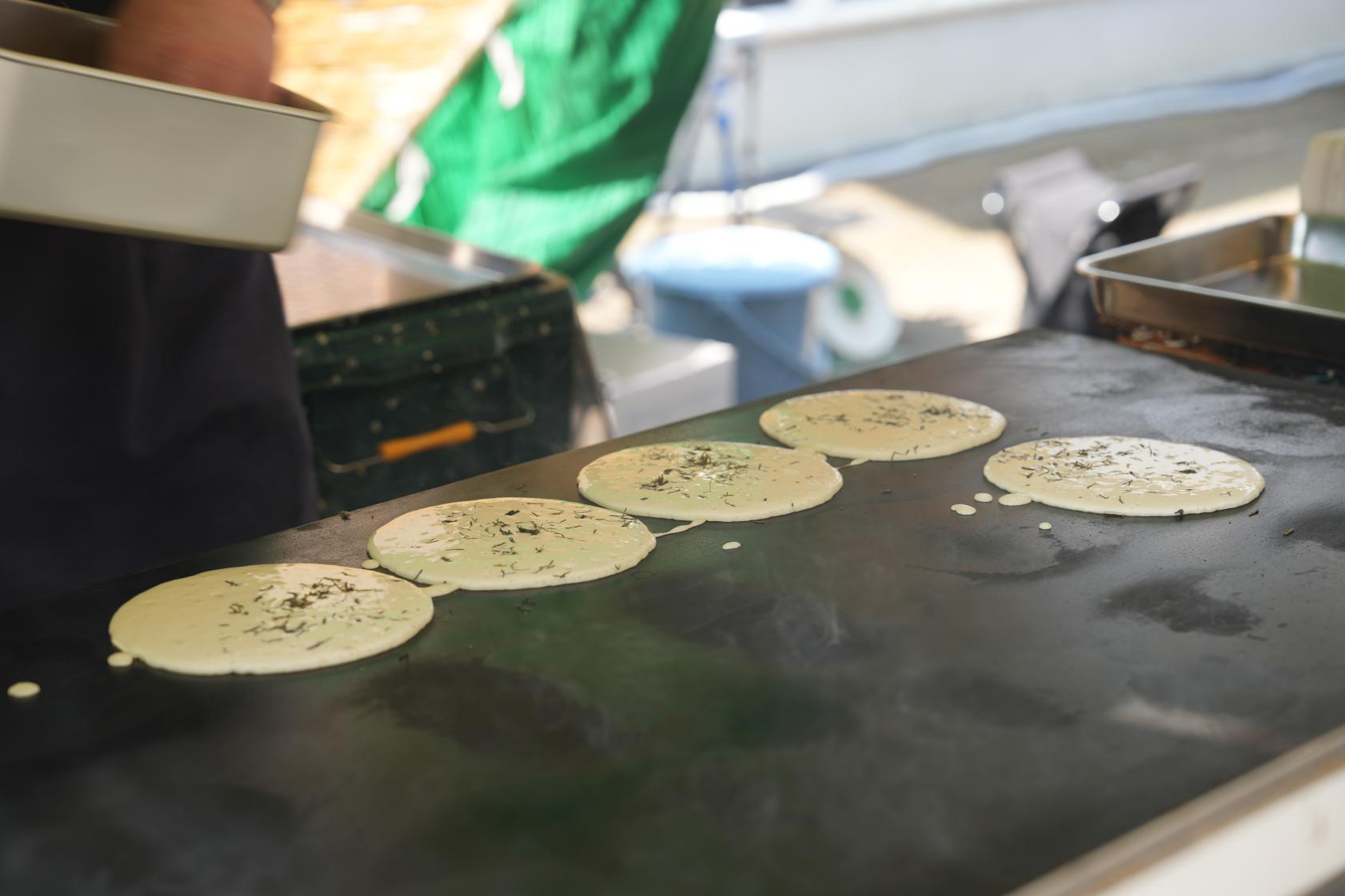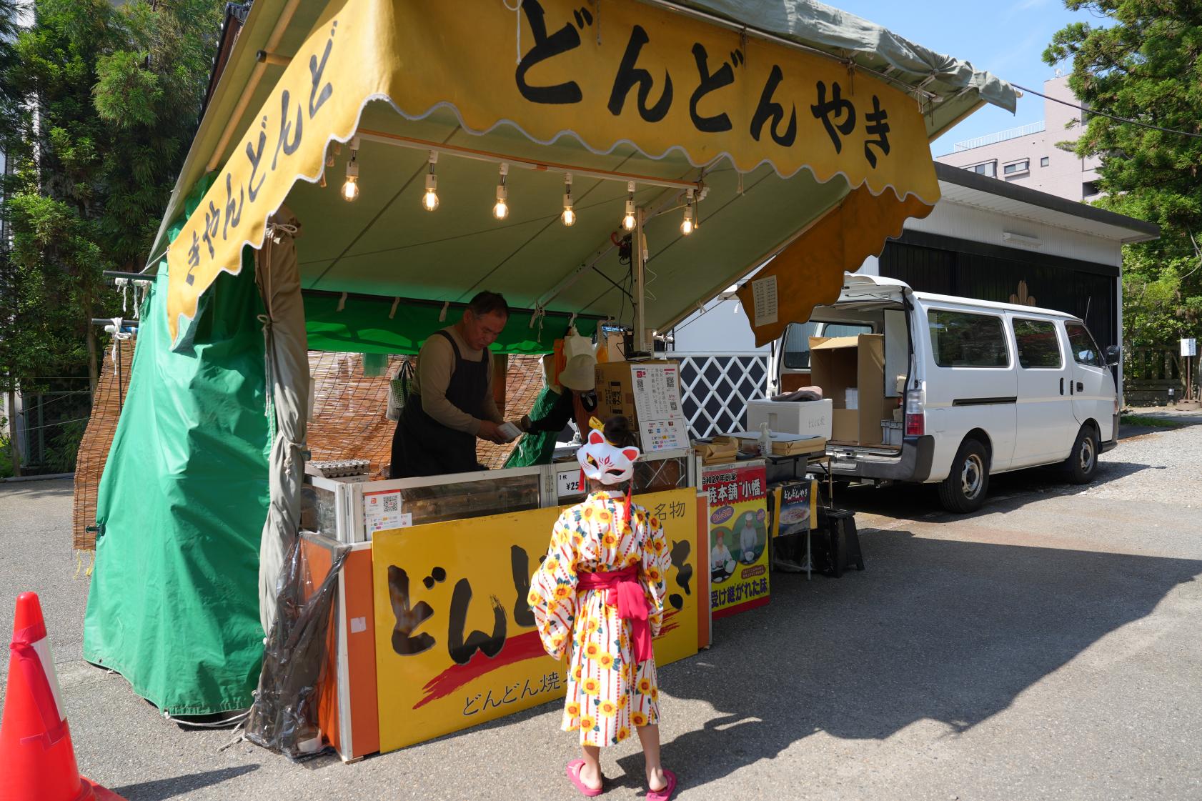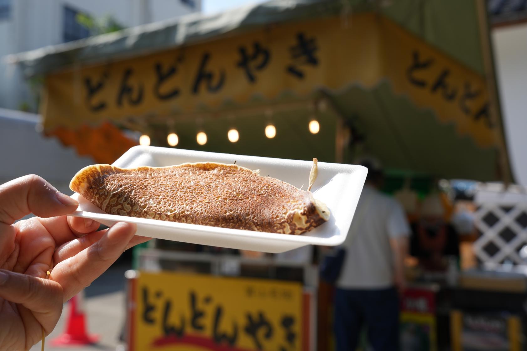 「どんどんやき」は、「山王まつり」を代表するグルメといっても過言ではないと思います。朝早く行ったため、まだお客さんは少なかったのですが、毎年、大人気で長い列ができています。外はカリっと、中はふんわりとした食感。具材は、とてもシンプルですが、特製のソースがマッチしており、とてもおいしい!大きな鉄板で焼かれ、出来立てを提供されるので、熱々を食べることができるのも魅力的な「どんどんやき」です。