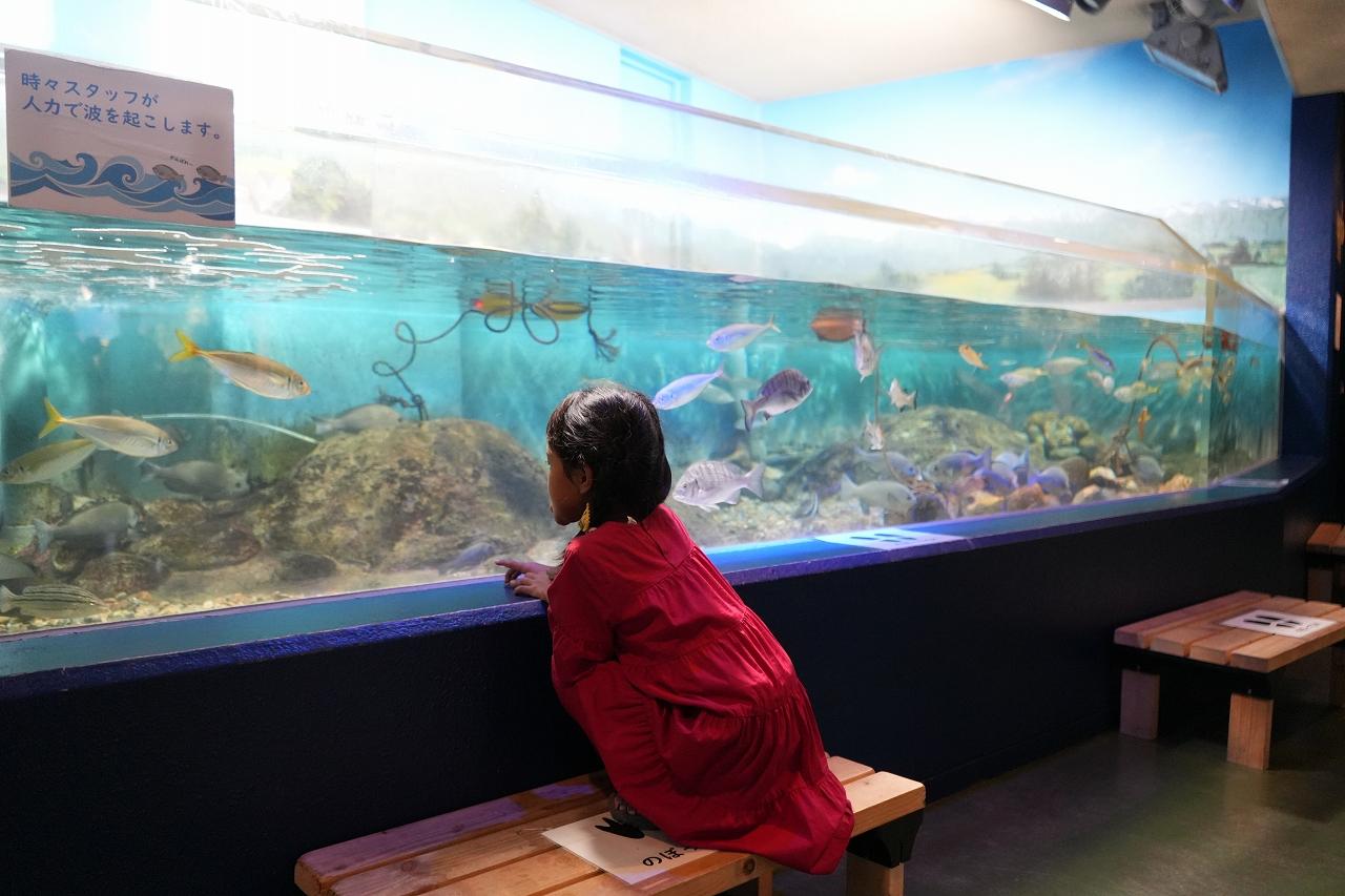 人力で波が起こせる水槽があります。ここでは、ガチャでえさを買うとエサやり体験もできます。(行ったときはお休み中でした。)